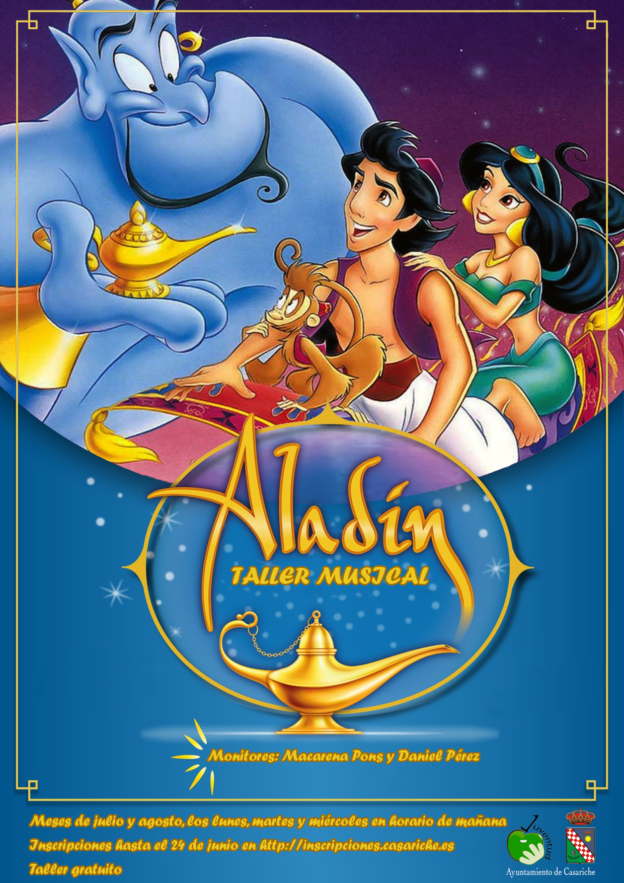 Si te gustan el teatro y la música, ahora tienes la oportunidad de participar en un nuevo Taller de Teatro organizado por la Delegación de Juventud del Excmo. Ayuntamiento de Casariche, en el que vamos a preparar el musical ‘Aladín’, que seguro será tan exitoso como los anteriores de ‘Hércules’, ‘La Bella y La Bestia’ o ‘Pesadilla antes de Navidad’.