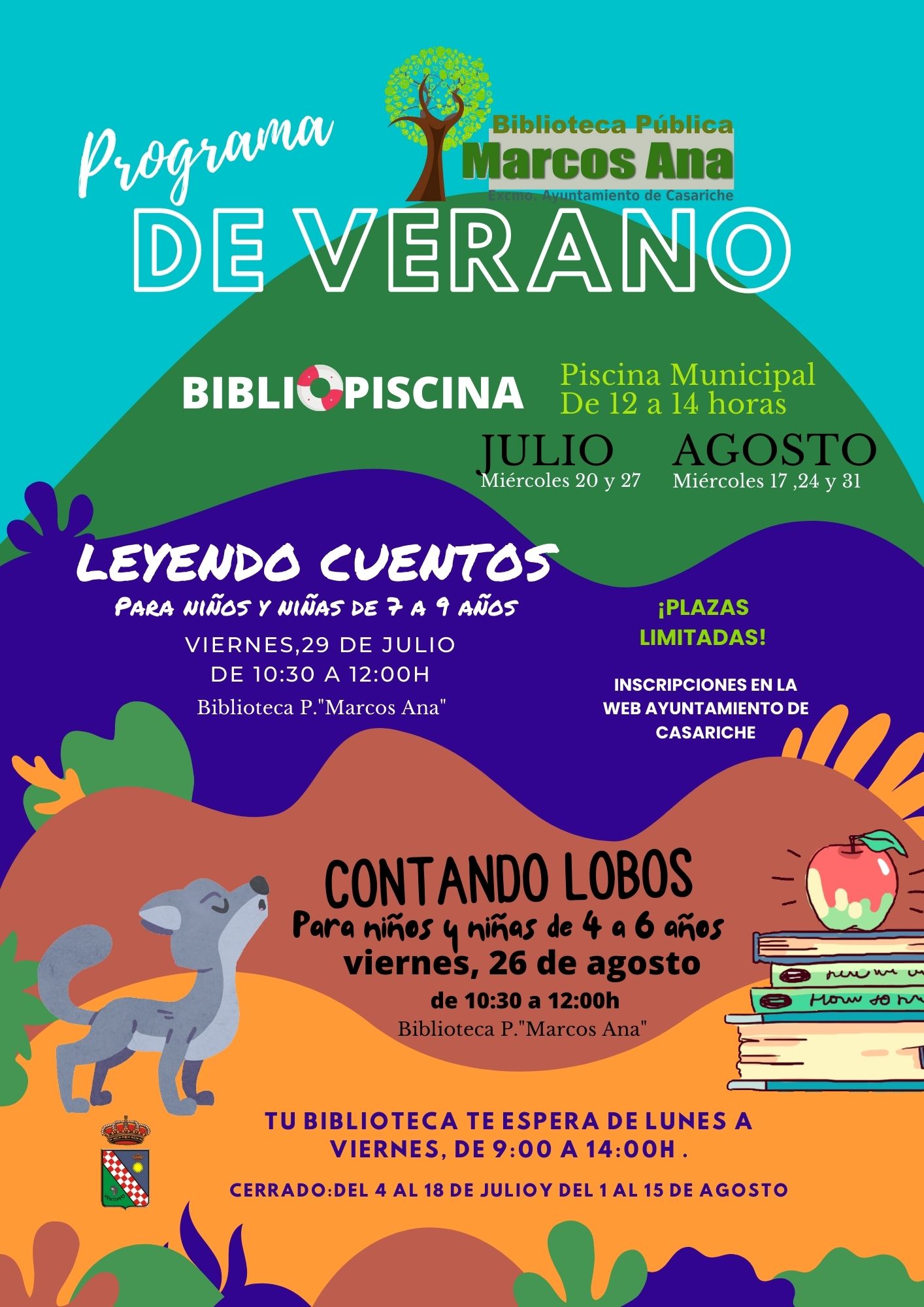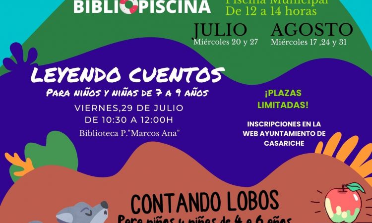 La Biblioteca Pública «Marcos Ana» tiene ya diseñada su programación especial para los meses de Julio y Agosto, que contempla cinco días de Bibliopiscina en nuestra piscina municipal (20 y 27 de Julio, 17, 24 y 31 de Agosto) y dos sesiones de cuenta cuentos: una el 29 de Julio, para niños/as de 7 a 9 años y otra el 26 de Agosto, para niños/as de 4 a 6 años.