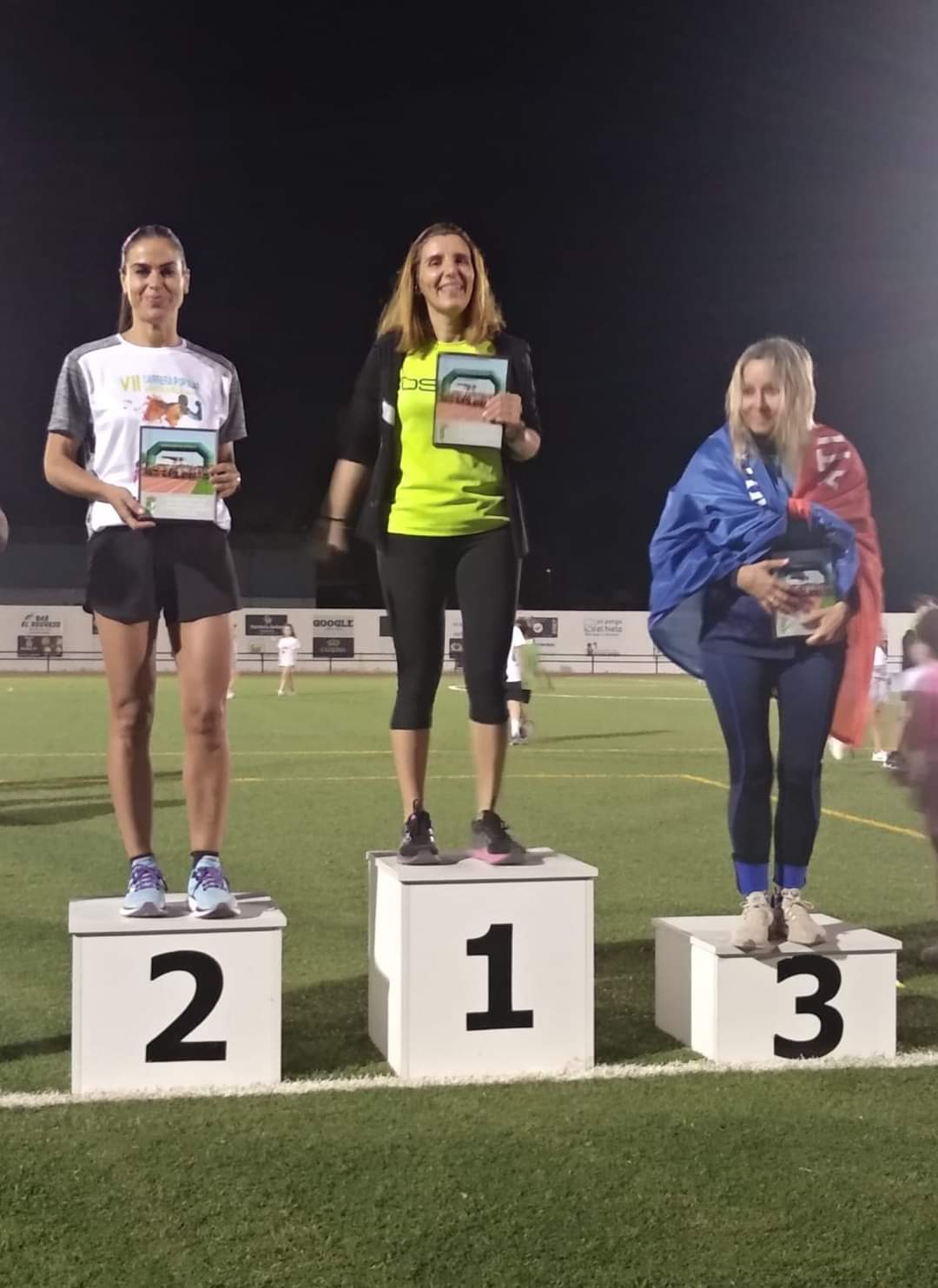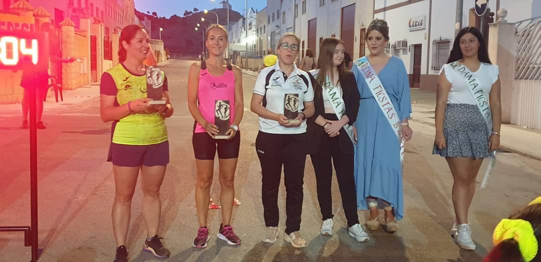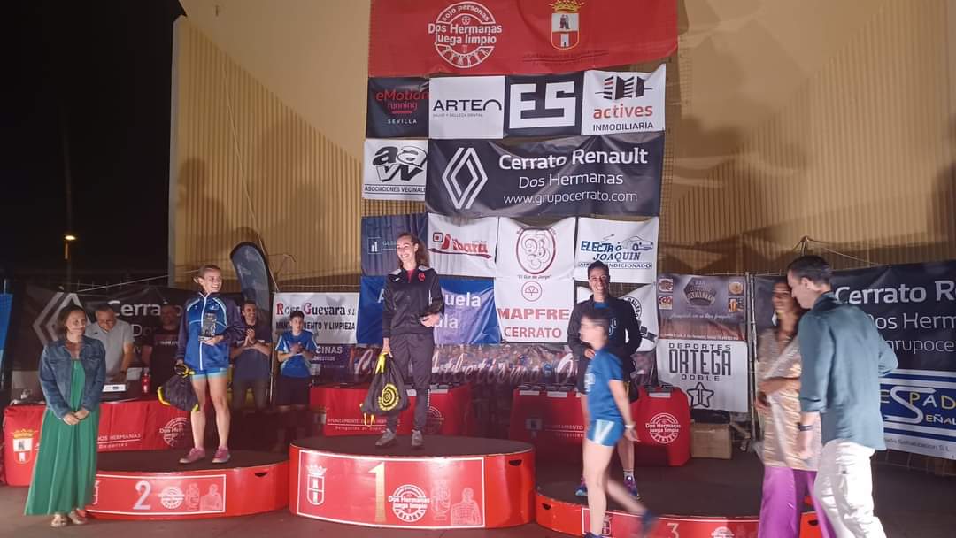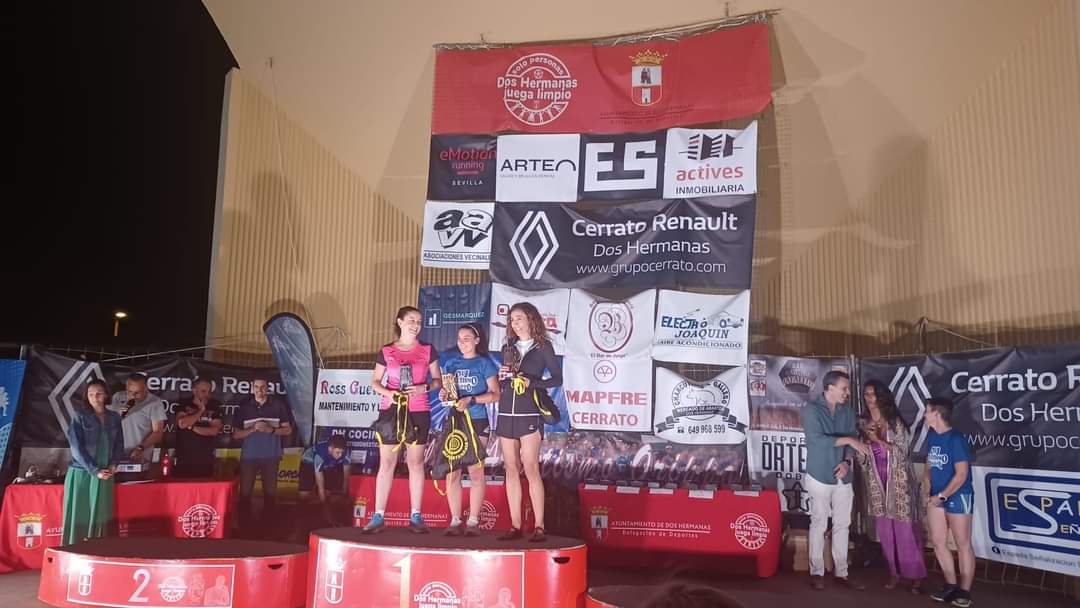 – Ese mismo días, un grupo de unos 9 atletas se trasladaron hasta Dos Hermanas para participar en la Carrera nocturna en homenaje a D. Antonio Guzmán Tacón, donde corrieron una distancia de algo menos de 10 km y consiguieron dos pódium, uno de Laura Moriana Muñoz 1ª en la categoría de Senior y Encarnación Carnerero Pérez 2a en la categoría veterano.
