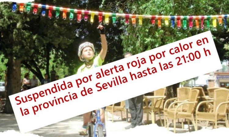 El Ayuntamiento informa que se suspende la Carrera de Cintas en Bici prevista para esta tarde debido a la alerta roja por calor activada hasta las 21:00 horas de hoy por la Agencia Estatal de Meteorología en la provincia de Sevilla, lo cual desaconseja la realización de cualquier actividad deportiva dentro de dicha franja horaria.
