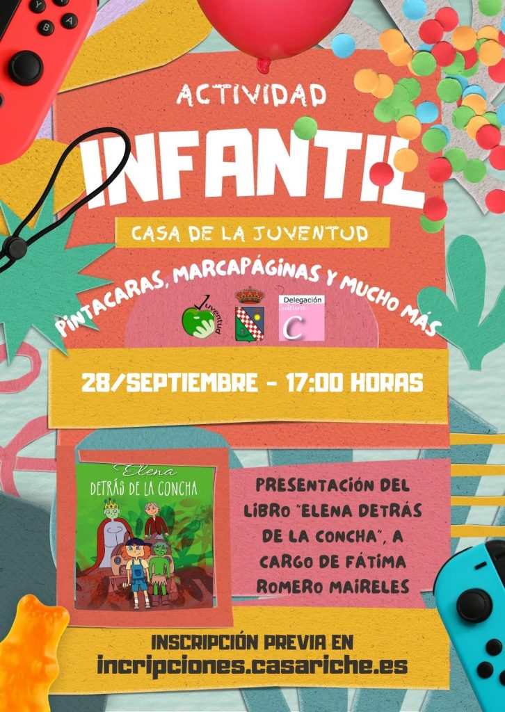 Los más pequeños se divertirán con pintacaras, marcapáginas y muchas más actividades de ocio. Además, la autora del libro «Elena detrás de la concha«, la estepeña Fátima Romero Maireles, lo presentará a todos los asistentes.
