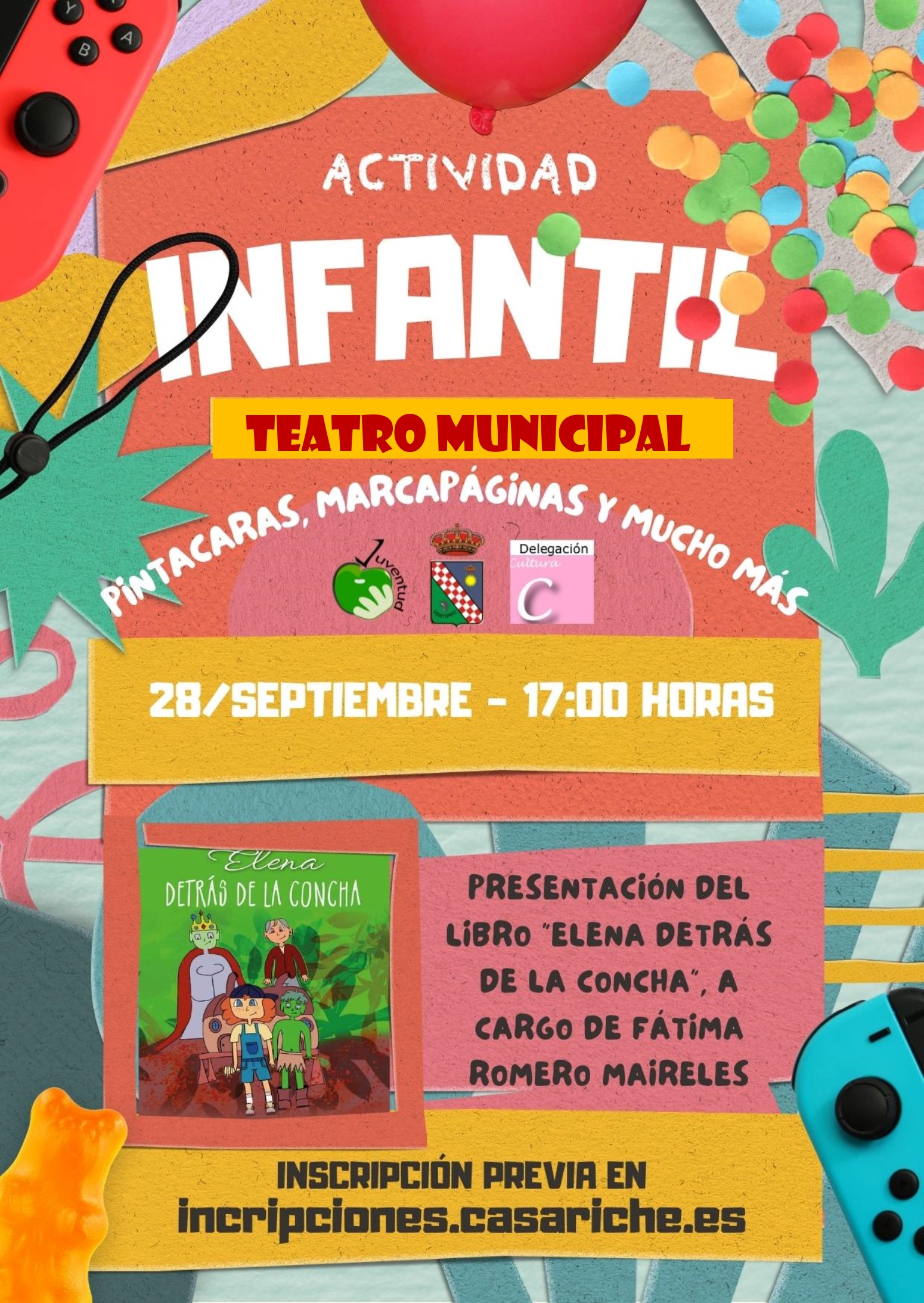 Dado el gran número de inscripciones que ha tenido la actividad de la fiesta infantil y la presentación del libro ‘Elena detrás de la concha’ del miércoles 28 de Septiembre, ésta se llevará a cabo finalmente en el Teatro Municipal, donde hay mayor aforo, manteniéndose el mismo horario previsto, las 17:00 h.