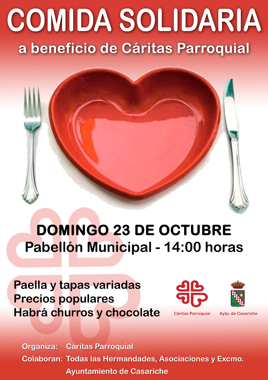 El domingo 23 de Octubre se celebra en el Pabellón Municipal de nuestra localidad, a partir de las 14:00 h, una Comida Solidaria a beneficio de Cáritas Parroquial.