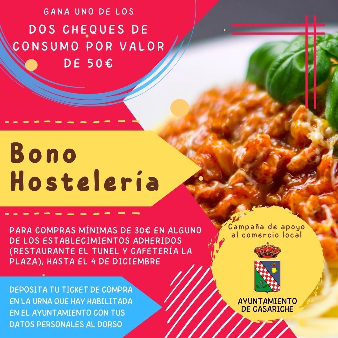 Desde el Ayuntamiento de Casariche, en el marco de la Campaña de Apoyo al Comercio Local, se pone en marcha el ‘Bono Hostelería’ en el que podrás conseguir cheques de consumo en los establecimientos hosteleros de la localidad adheridos a la iniciativa.