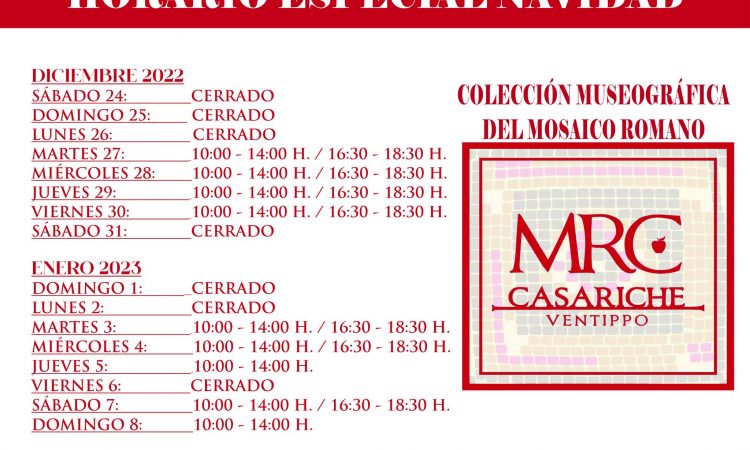 Con motivo de las fiestas navideñas, la Colección Museográfica del Mosaico Romano de Casariche tendrá una apertura diferente a la habitual.
