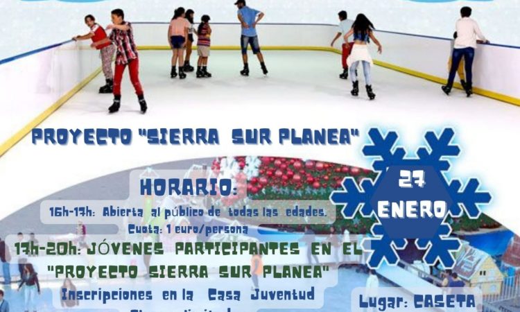 Se trata de una tarde de patinaje sobre hielo artificial que se llevará a cabo el 27 de Enero en nuestra localidad. La pista, que se ubicará en la Caseta Municipal, estará disponible de 17:00 h a 20:00 h para los jóvenes participantes en el proyecto ‘Sierra Sierra Sur Planea’, que además participarán en una serie de actividades complementarias; en este caso, dado que las plazas son muy limitadas, es recomendable apuntarse lo antes posible.