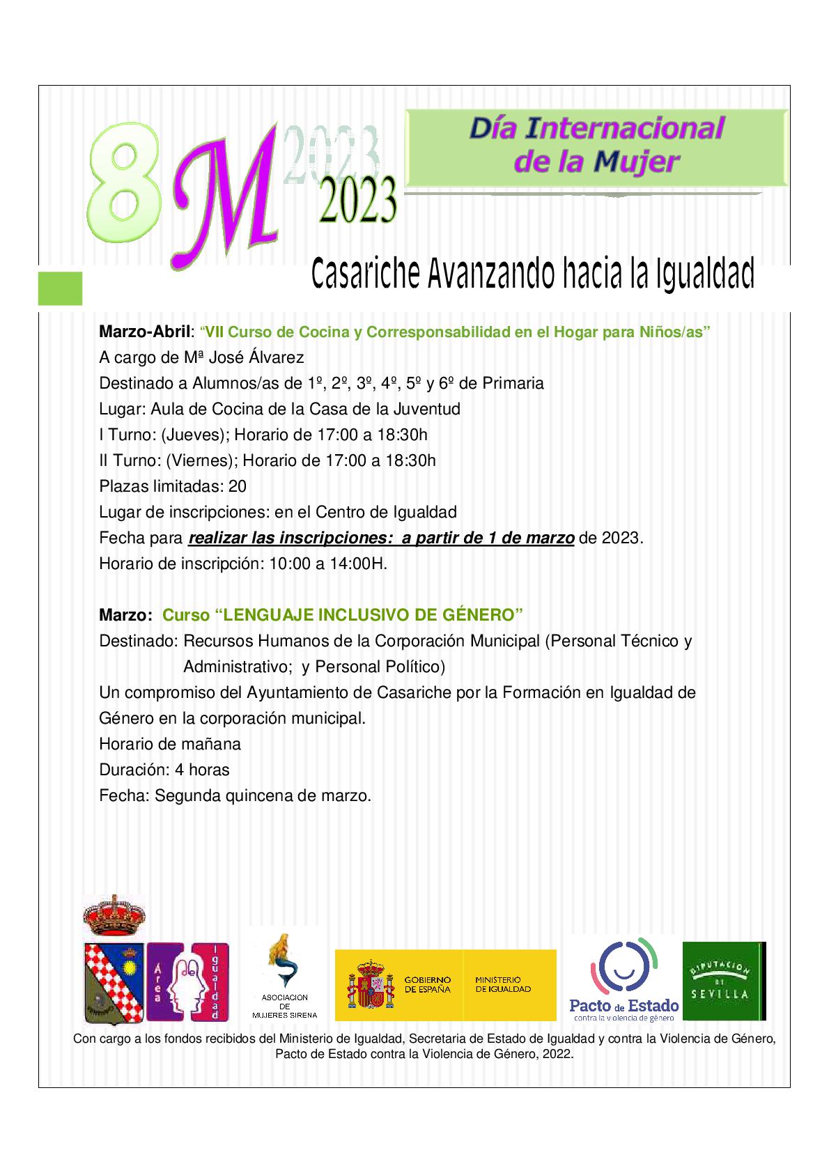 La Campaña de Sensibilización y Formación 8M – Día Internacional de la Mujer 2023 ha sido financiada con cargo a los créditos recibidos del Ministerio de Igualdad, Secretaría de Estado de Igualdad y contra la Violencia de Género. Pacto de Estado contra la Violencia de Género, 2022. Por Diputación de Sevilla a través del Proyecto ‘Casariche Avanzando hacia la Igualdad’, y finalmente, por el Ayuntamiento de Casariche. Asimismo, cuenta con la colaboración de la Asociación de Mujeres ‘Sirena’ de nuestra localidad.