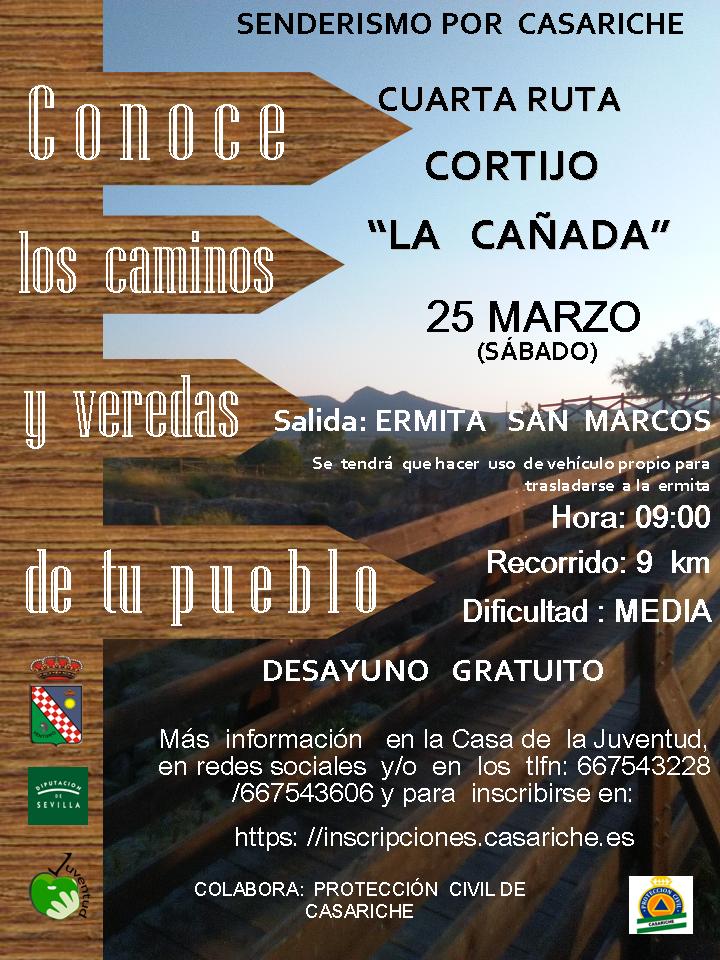 La Delegación de Juventud nos presenta hoy la cuarta ruta enmarcada en el programa «Conoce los caminos y veredas de tu pueblo» de esta temporada, que se celebrará el sábado 25 de Marzo y nos llevará al Cortijo ‘La Cañada’’. Se trata de una ruta de dificultad media y de 9 km de recorrido, y durante la misma tendremos la oportunidad de admirar la belleza de los almendros en flor.