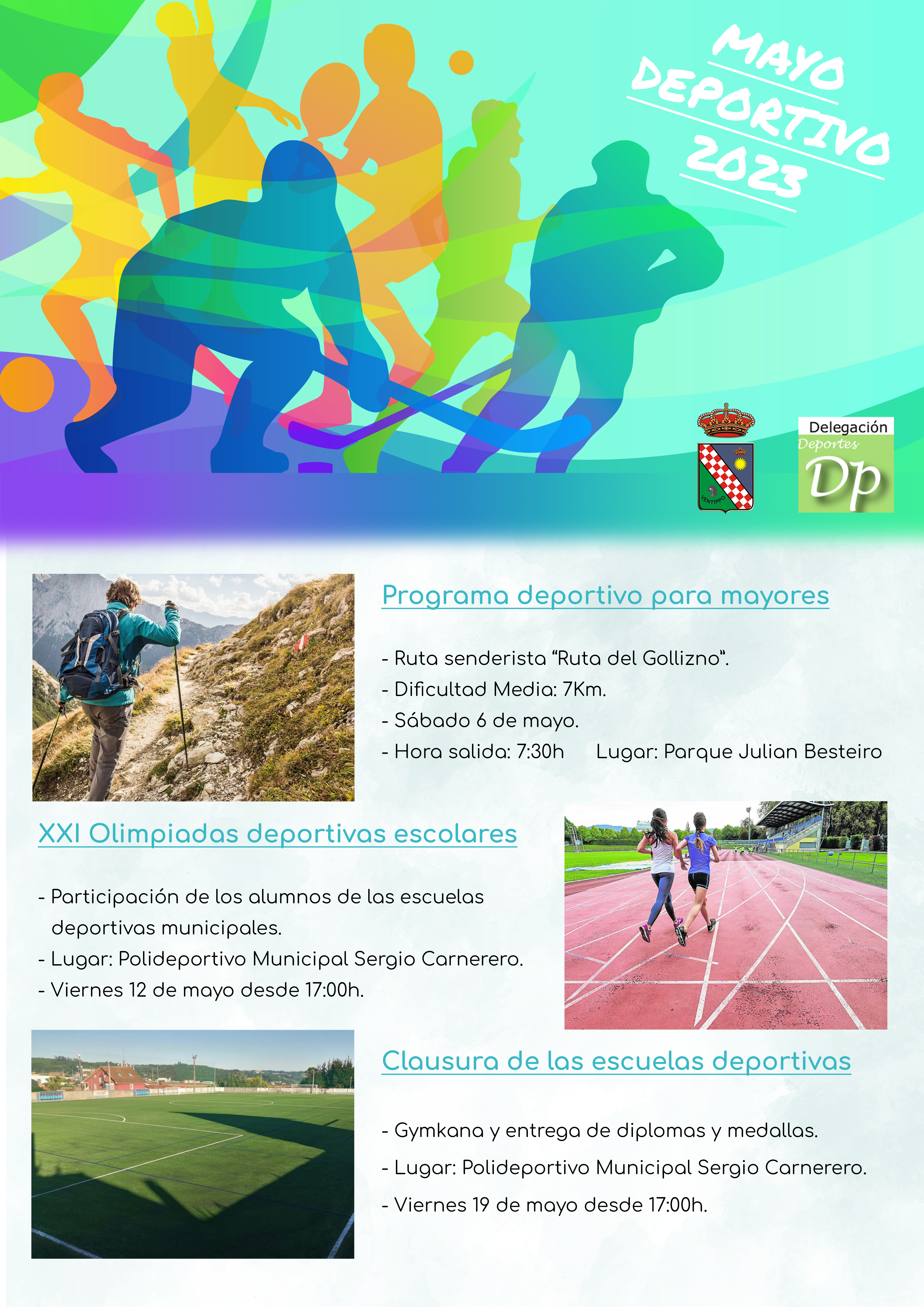 - 12 de Mayo: Desde las 17:00 h, se celebrarán las XXI Olimpiadas Escolares Deportivas Municipales, con la participación del alumnado de las escuelas deportivas municipales.
