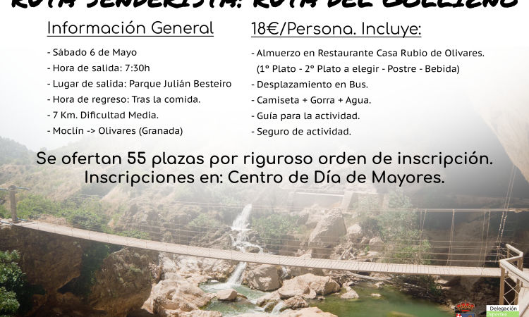 Enmarcada en el Programa Deportivo de Mayores y formando parte del Programa ‘Mayo Deportivo’, ya están abiertas las inscripciones en la ruta senderista ‘Ruta del Gollizno’, que se llevará a cabo el 6 de Mayo, saliendo a las 7 y media de la mañana del Parque Julián Besteiro y cuyo regreso a nuestro municipio está previsto tras el almuerzo.