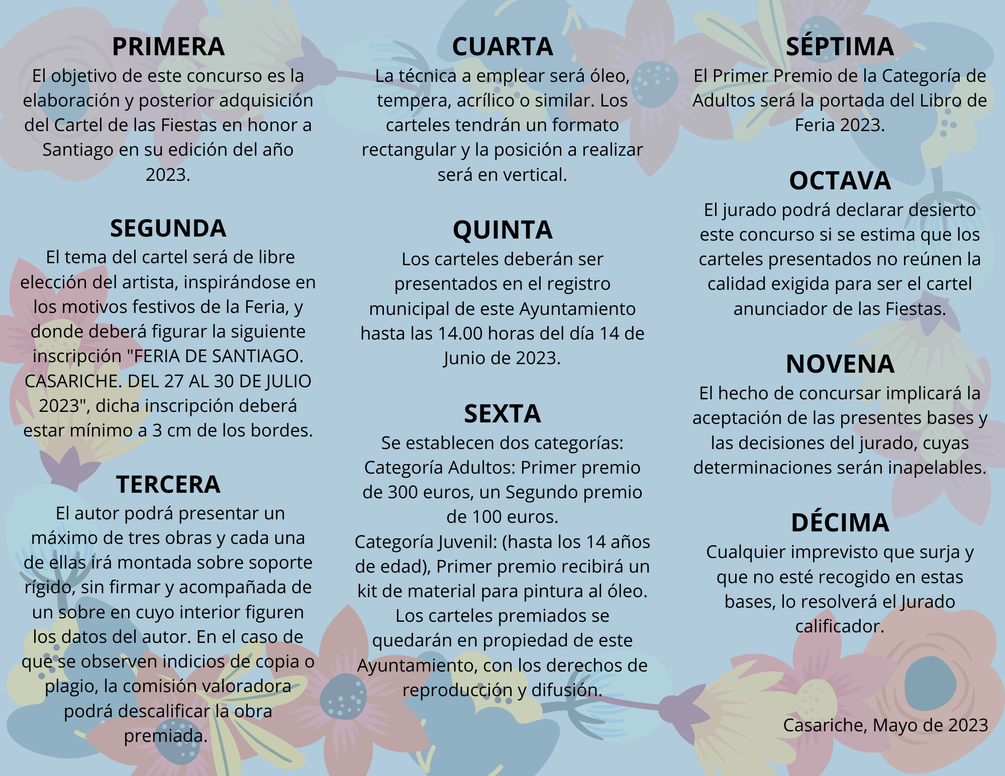Tras haberse detectado un error en la fecha de inicio de nuestra Feria de este año en las Bases del Concurso Local para la elección del Cartel Anunciador de las Fiestas en honor a Santiago 2023, procedemos a incluir las bases con este error subsanado, ‘FERIA DE SANTIAGO. CASARICHE. DEL 27 AL 30 DE JULIO DE 2023’.