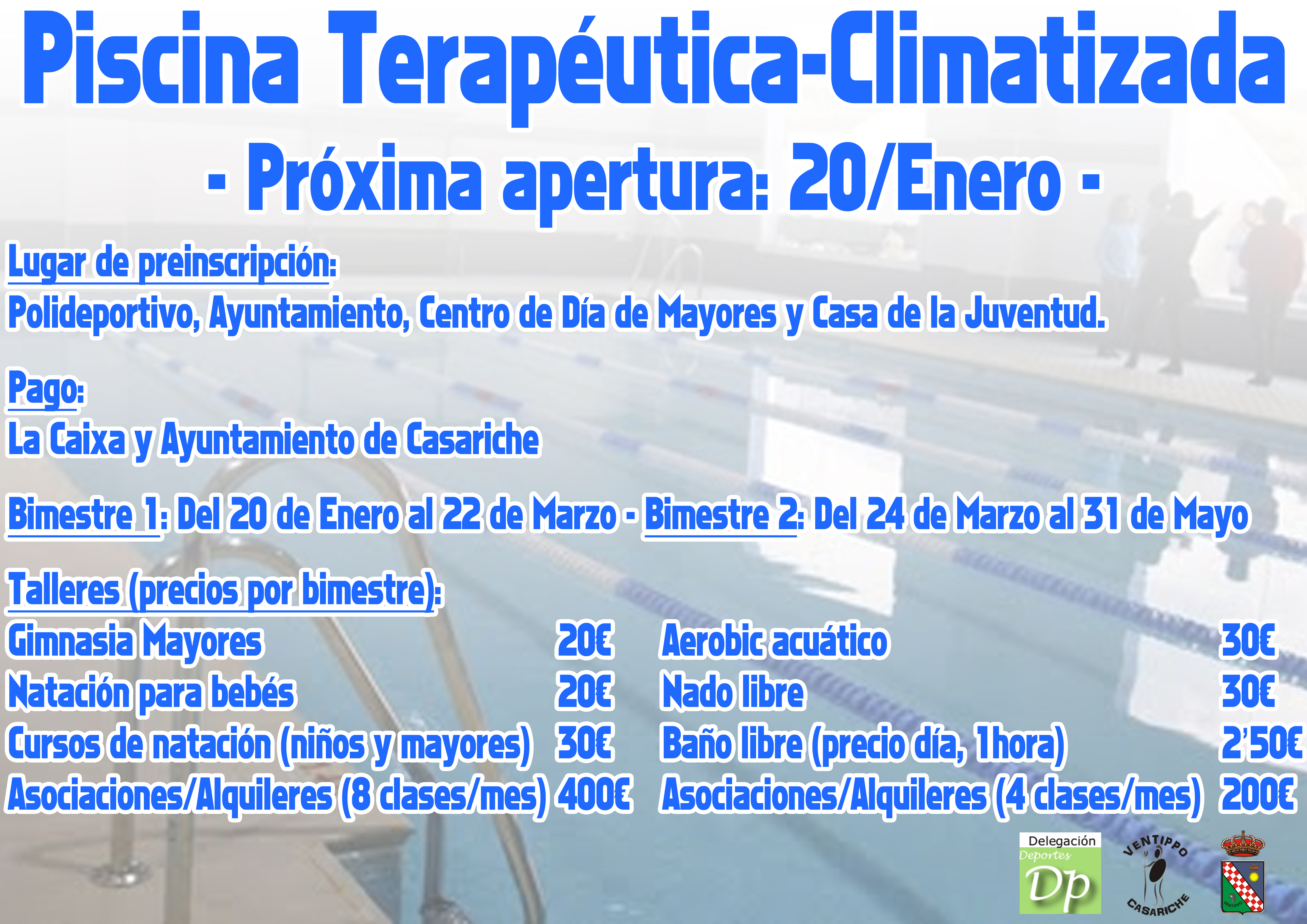 El próximo 20 de Enero se ponen en marcha nuevos talleres, de carácter bimensual, en la Piscina Terapeútica de Casariche, que estarán funcionando hasta finales de Mayo, durante dos bimestres ( BIMESTRE 1: DEL 20 DE ENERO AL 22 DE MARZO y BIMESTRE 2: DEL 24 DE MARZO AL 31 DE MAYO).