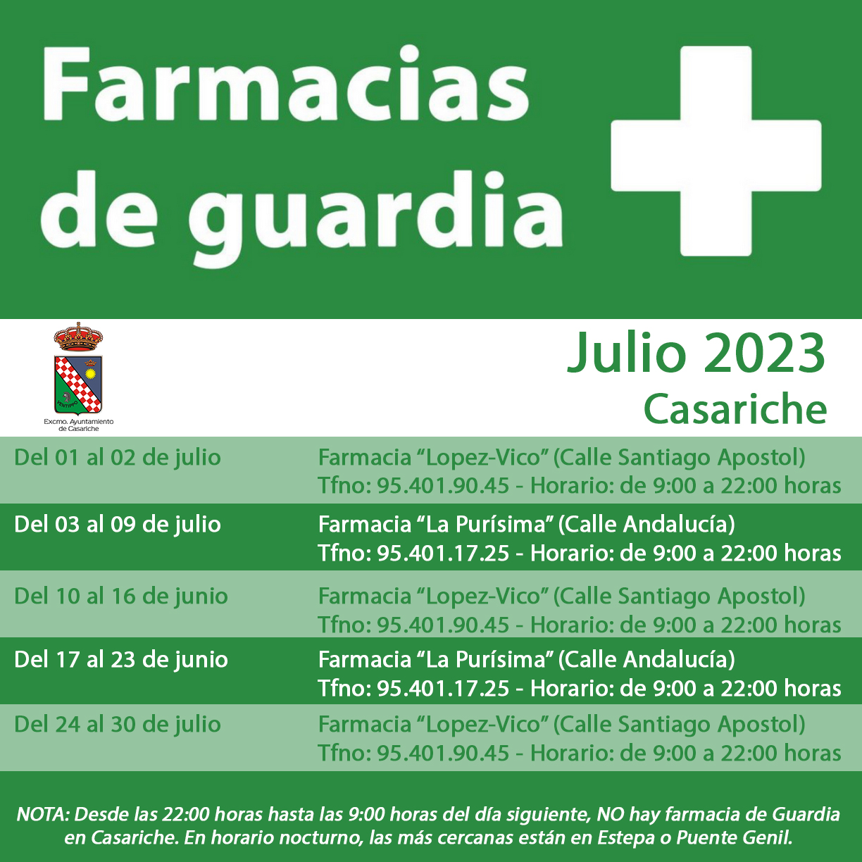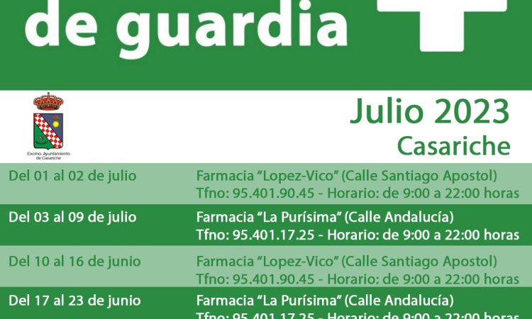 Con el fin de que nuestros vecinos y vecinas puedan saber en todo momento qué farmacia está de guardia en nuestro municipio, el Ayuntamiento pone a su disposición la información sobre las farmacias de guardia durante el mes de julio, incluyendo sus números de teléfono y el horario de apertura que tienen.
