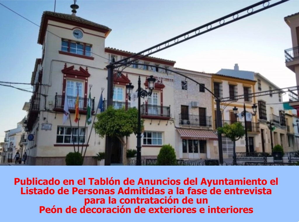 Publicado en el Tablón de Anuncios del Ayuntamiento el Listado de Personas Admitidas a la fase de entrevista para la contratación de un Peón de decoración de exteriores e interiores