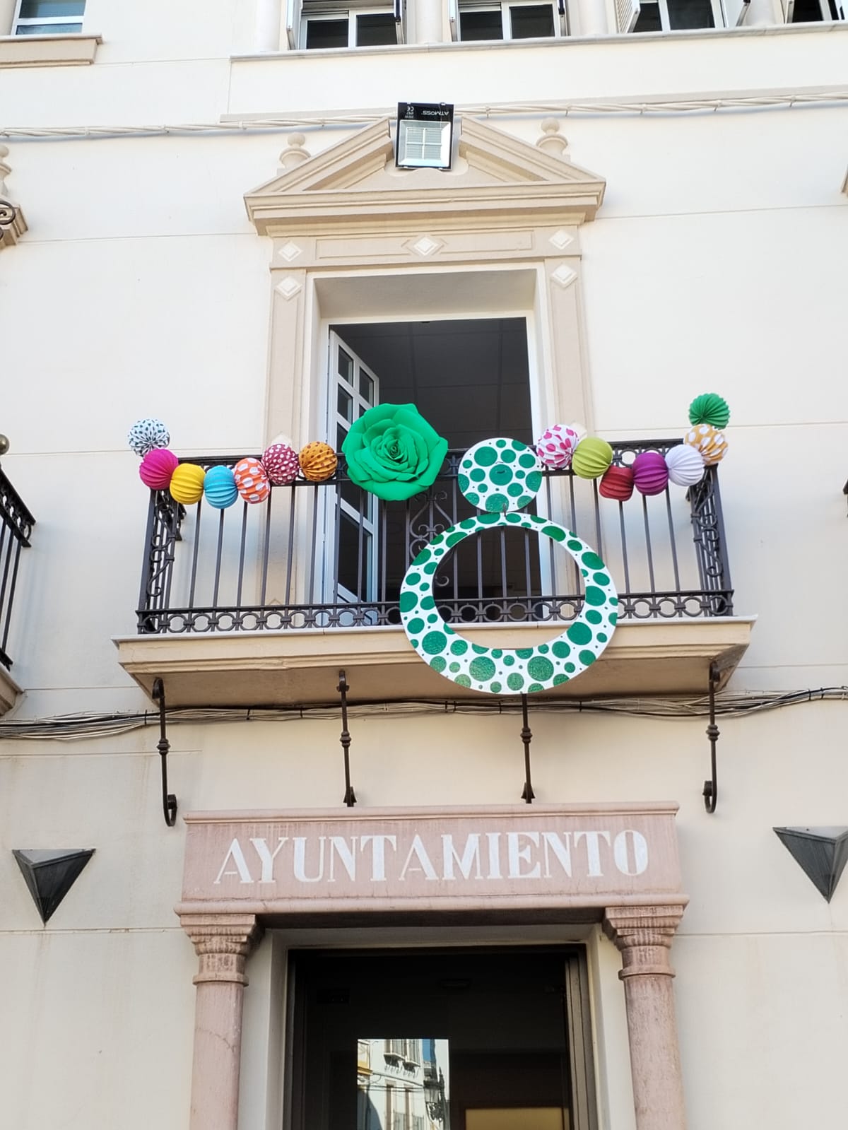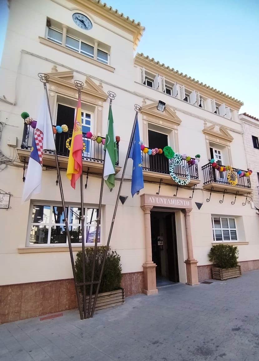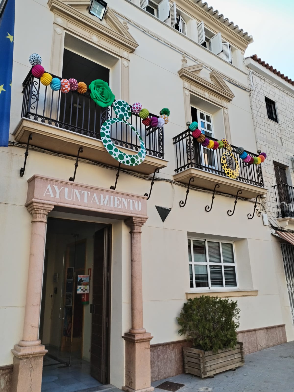 La fachada del Ayuntamiento está también ya engalanada con motivo del comienzo de nuestra Feria de Santiago 2023 la próxima semana.