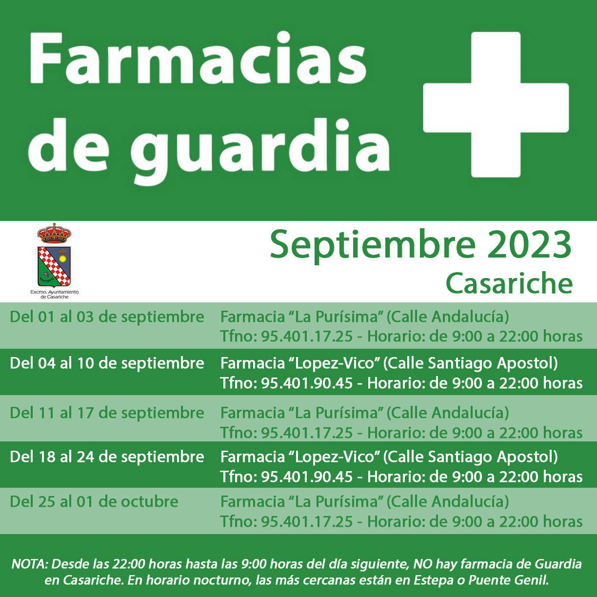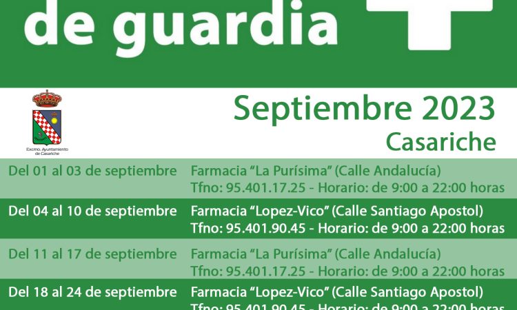 Ya llegó Septiembre y con el fin de que nuestros vecinos y vecinas puedan saber en todo momento qué farmacia estará de guardia en nuestro municipio, el Ayuntamiento pone a su disposición la información relativa a las farmacias de nuestra localidad, incluyendo sus números de teléfono y el horario de apertura que tienen cada uno de los fines de semana del presente mes.