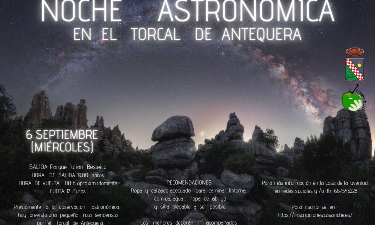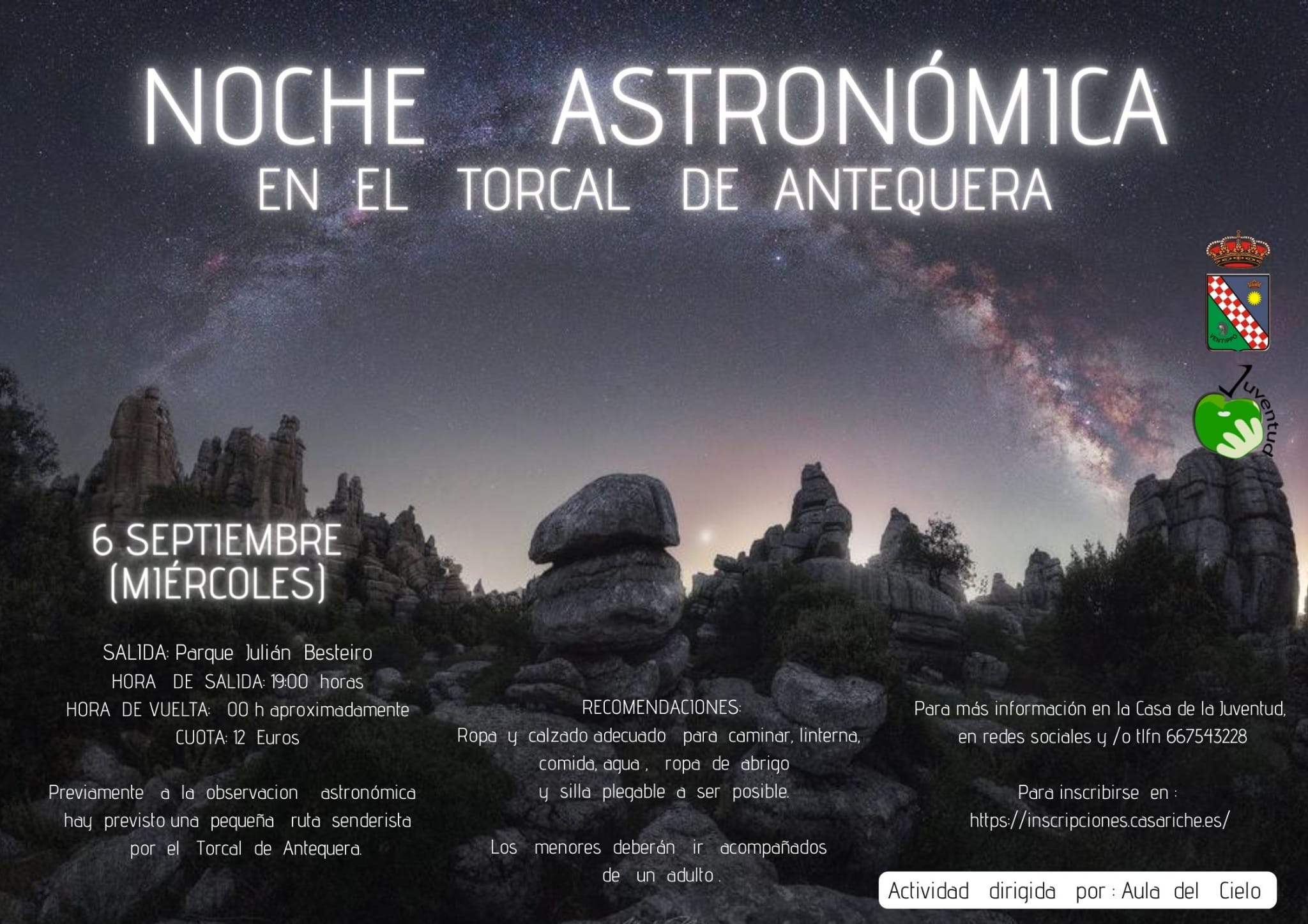La Delegación de Juventud pone en marcha una nueva actividad de ocio y tiempo libre. Se trata de una noche astronómica en el Torcal de Antequera acompañada por una pequeña ruta senderista por este fabuloso Paraje Natural, apta para toda la familia y en la que la naturaleza junto a las estrellas serán las mejores aliadas para que todas las personas que deseen formar parte de esta jornada pasen una velada estival inolvidable.