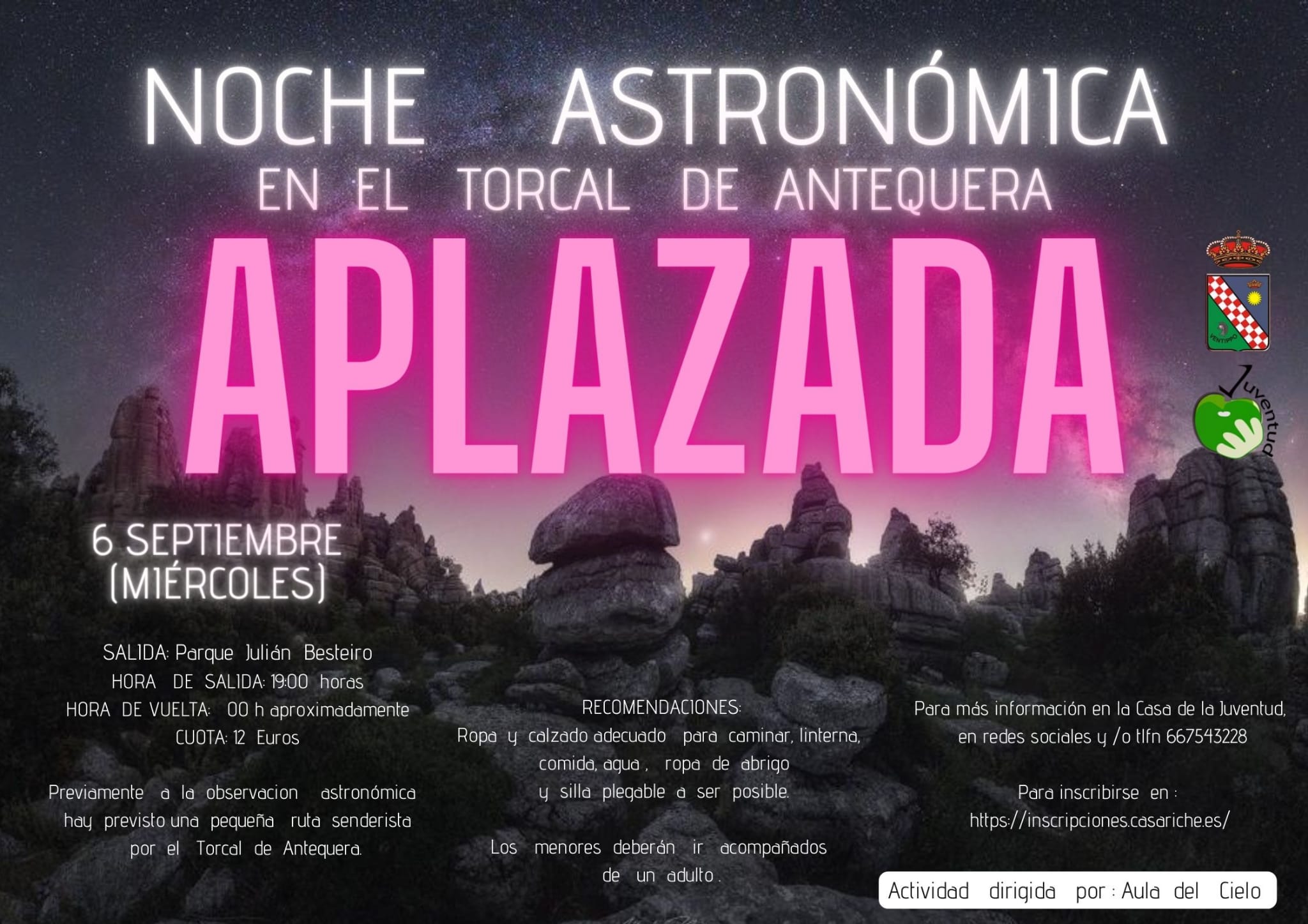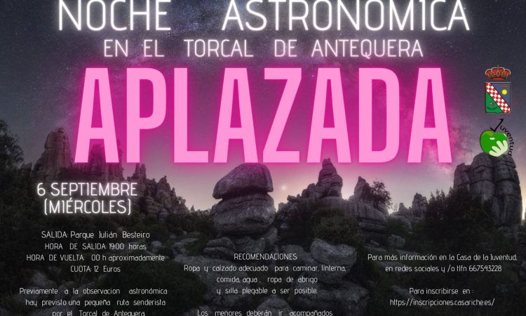 Desde la Delegación de Juventud comunicamos que, lamentablemente, la actividad «Noche Astronómica en el Torcal de Antequera» programada para mañana miércoles 6 de septiembre va a ser aplazada debido a las condiciones meteorológicas que se prevén y, que dificultan considerablemente, que dicha actividad pueda llegar a desarrollarse con normalidad tal y como estaba prevista.