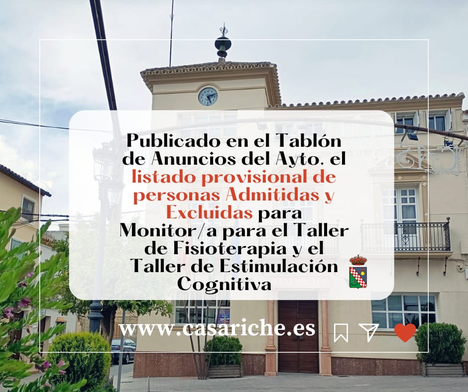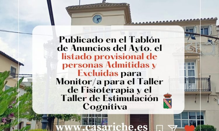 Desde la Delegación de Empleo informamos a todos los vecinos y vecinas de Casariche que ya está disponible el Listado Provisional de personas Admitidas y Excluidas de Monitor/a para el Taller de Fisioterapia y el Taller de Estimulación Cognitiva. Dicho listado se puede consultar tanto en el Tablón de Anuncios de nuestro Ayuntamiento y en el E-tablón.
