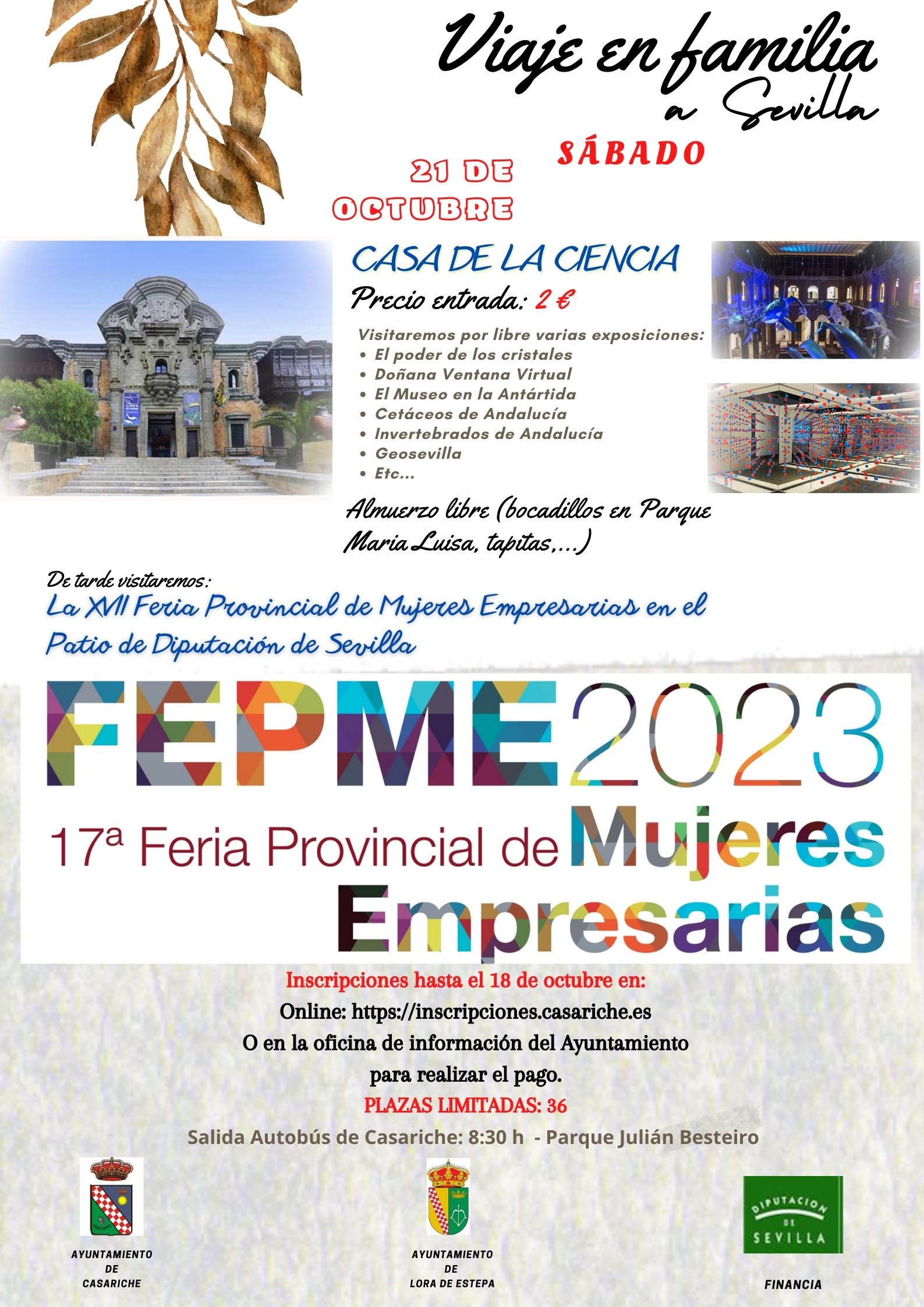 La Delegación de Igualdad ha organizado un viaje a Sevilla para el sábado 21 de octubre, que incluye las visitas a la Casa de la Ciencia y a la XVII Feria Provincial de Mujeres Empresarias (FEPME) 2023 organizada por la Diputación de Sevilla.