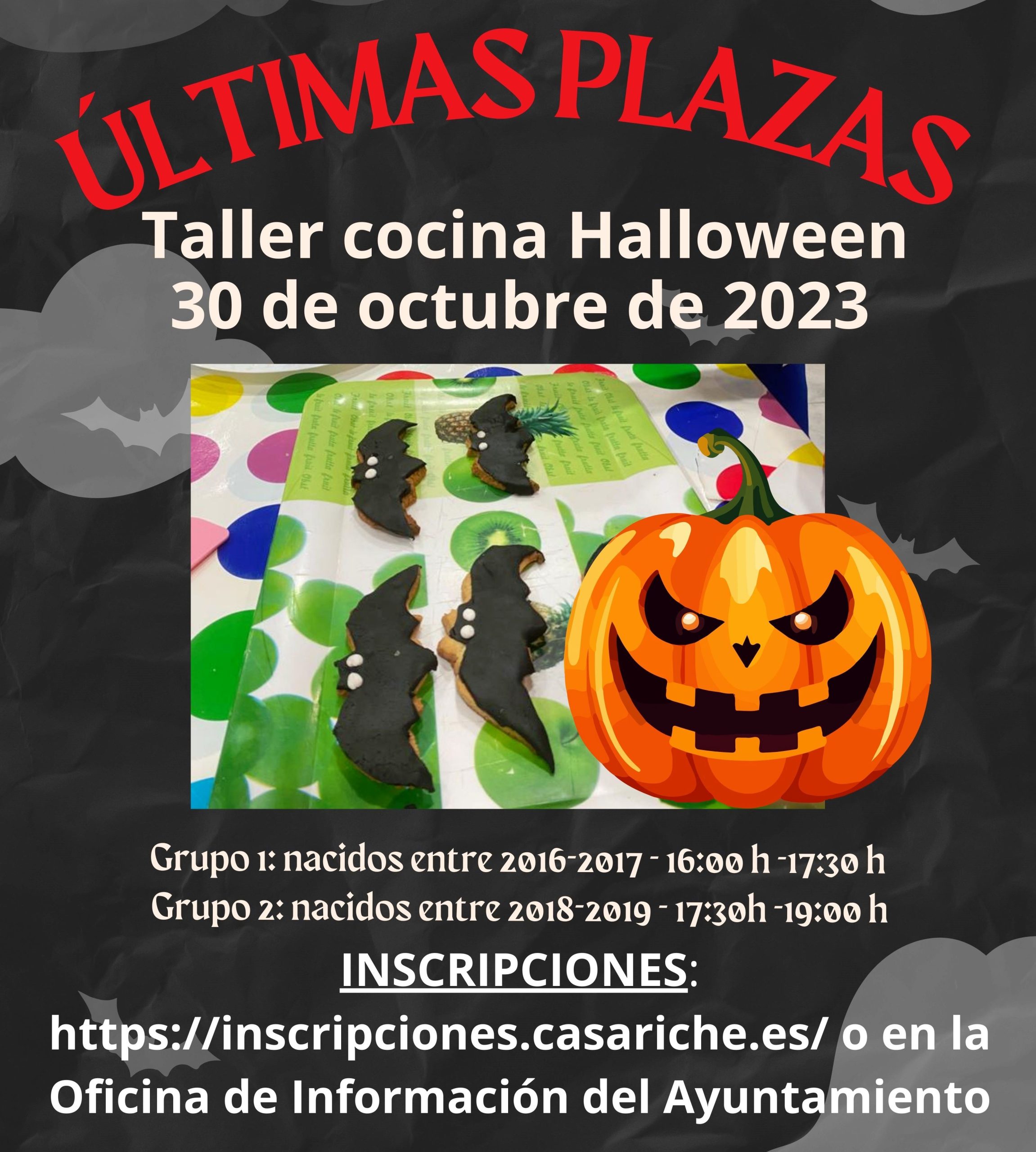 La Delegación de Juventud informa que se ha abierto un periodo extraordinario de inscripciones para cubrir las últimas plazas disponibles para el Taller de Cocina de Halloween del día 30 de octubre, en concreto, para los grupos 1 (de 16:00 a 17:30h) y grupo 2 (de 17:30 a 19:00 h).