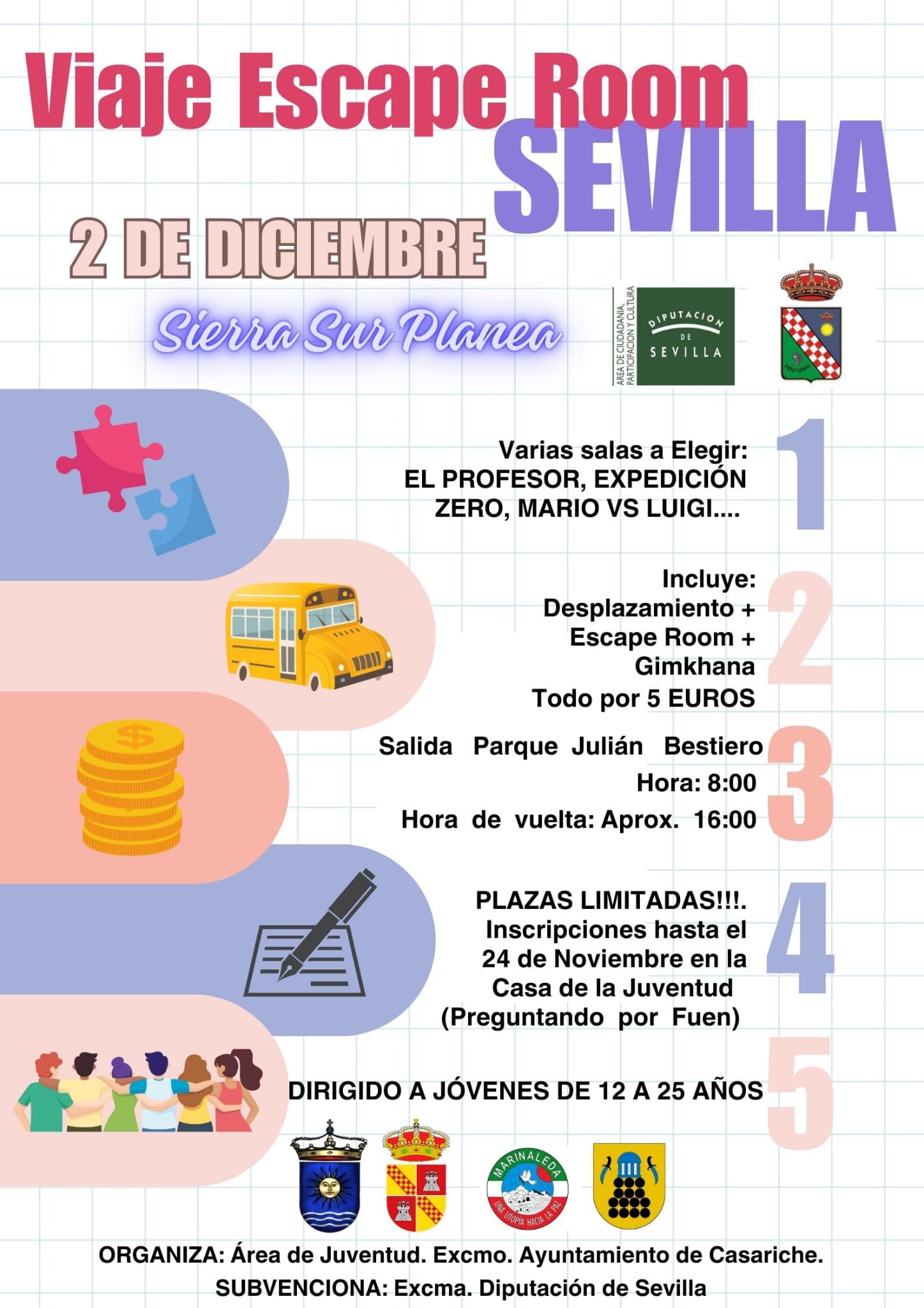 La propuesta que presentamos hoy se llevará a cabo el 2 de Diciembre, está dirigida a jóvenes de 12 a 25 años y consiste en un viaje a Sevilla para participar en una actividad de Escape Room, con varias salas a elegir, como El Profesor, Expedición Zero, Mario vs Luigi, entre otras, y en una Gimkhana muy atractiva. La salida será a las 08:00 h de la mañana desde el Parque Julián Besteiro.