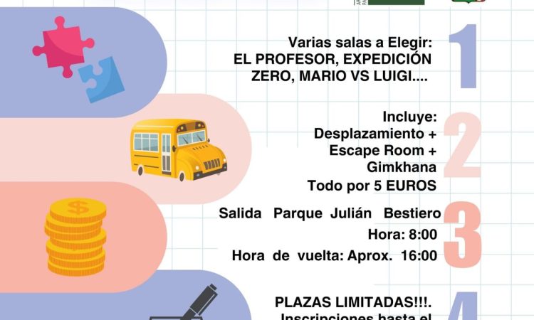Os recordamos que las plazas son muy limitadas, por lo que es recomendable apuntarse lo antes posible. La inscripción son 5 € por persona e incluye el desplazamiento más el Escape Room y la Gimkhana.