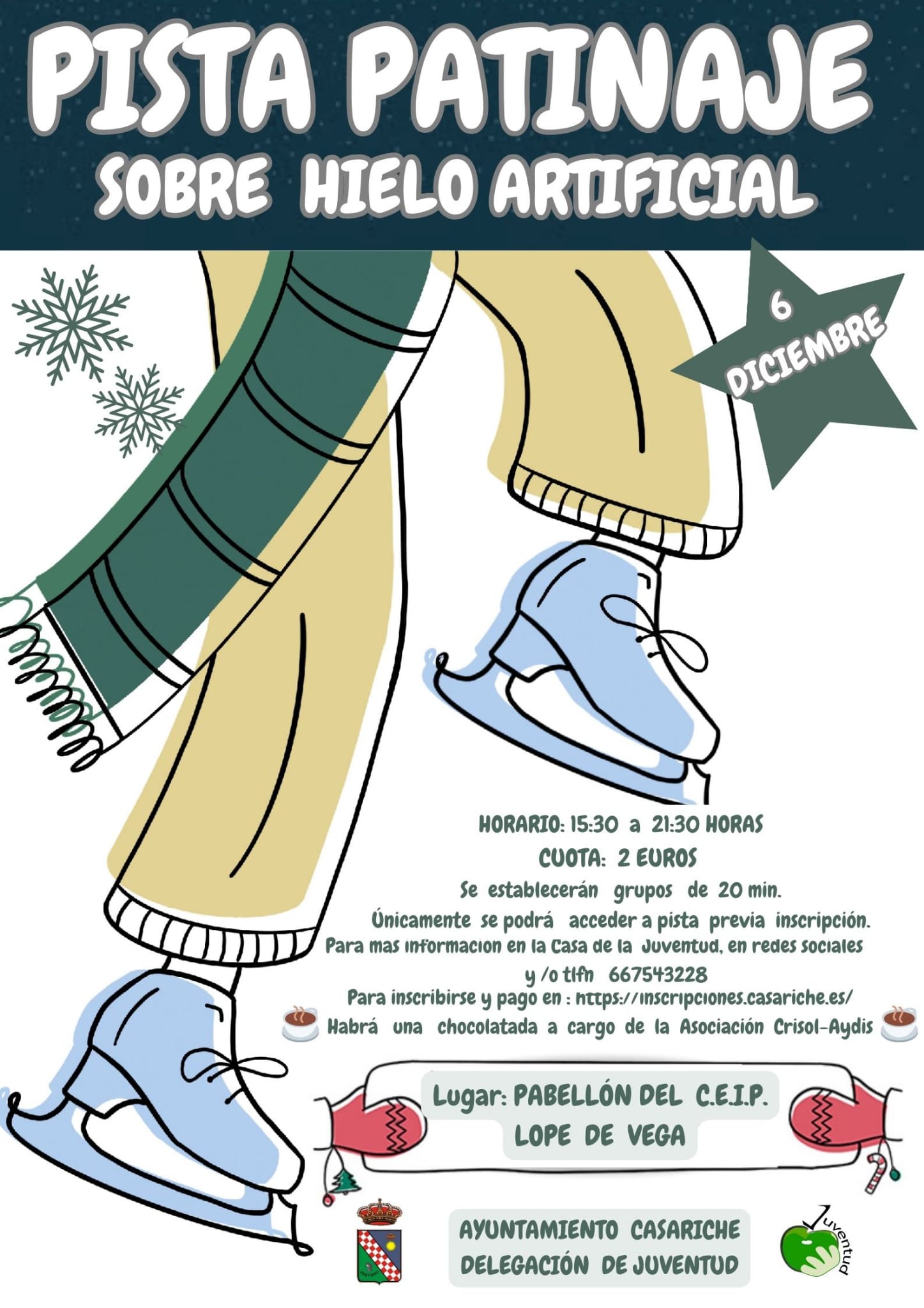 El próximo 6 de diciembre tenemos una actividad que seguro os va a encantar. Tendremos una pista de patinaje sobre hielo artificial, que se ubicará en el Pabellón Cubierto del CEIP Lope de Vega y estará en funcionamiento de 15:30 h a 21:30 h.