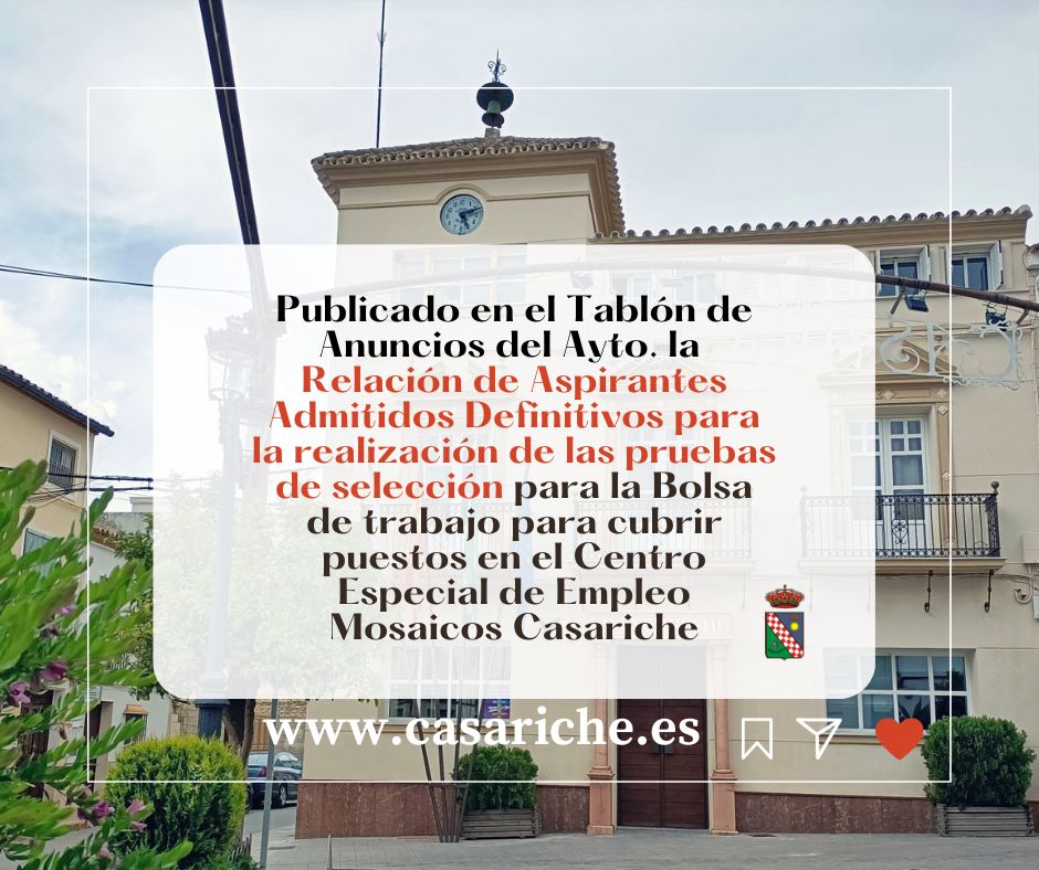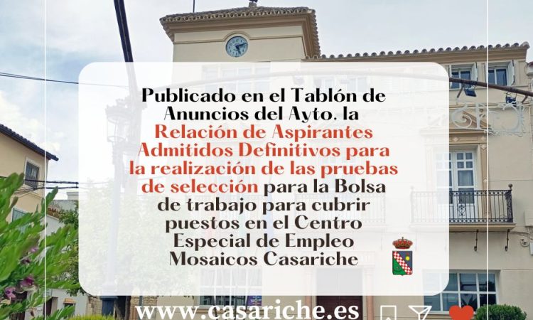 Desde la Delegación de Empleo informamos a todos los vecinos y vecinas de Casariche que ya está disponible la Relación de Aspirantes Admitidos para la realización de las pruebas selectivas para la creación de una Bolsa de Trabajo integradas por personas con discapacidad igual o superior al 33%, para cubrir puestos de trabajo por circunstancias de la producción y sustitución de persona trabajadora, para el desempeño del puesto de Operario/Peón, en el Centro Especial de Empleo Mosaicos Casariche, S.L.U.