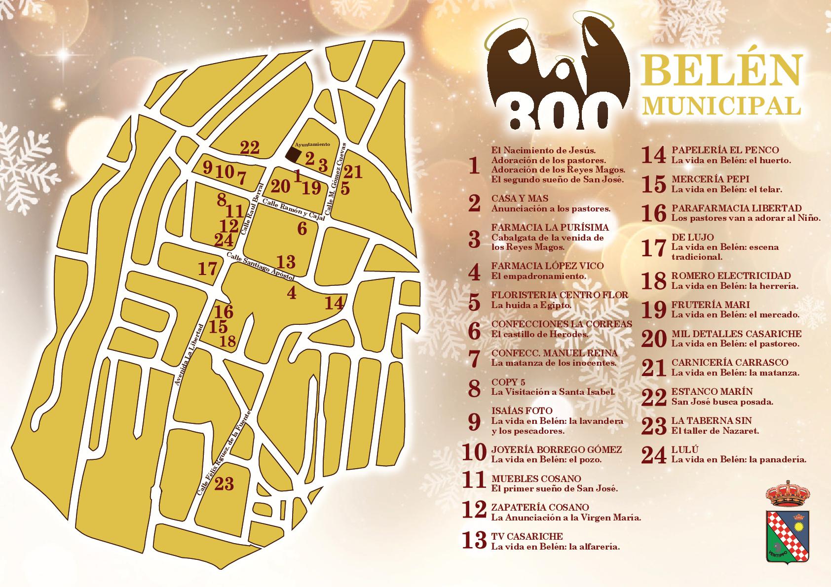 Para celebrarlo, nuestro Belén Municipal sale a la calle y distintas escenas del mismo podrán admirarse en distintos lugares de nuestro pueblo. En concreto, son un total de 24 puntos, en la calle Andalucía, donde se ubicarán el Nacimiento de Jesús, la Adoración de los Pastores, la Adoración de los Reyes Magos y el Segundo Sueño de San José, y otros 23 comercios de nuestra localidad, cuyos nombres, nombre de la escena del Belén que albergan y ubicaciones pueden consultarse en el mapa adjunto.