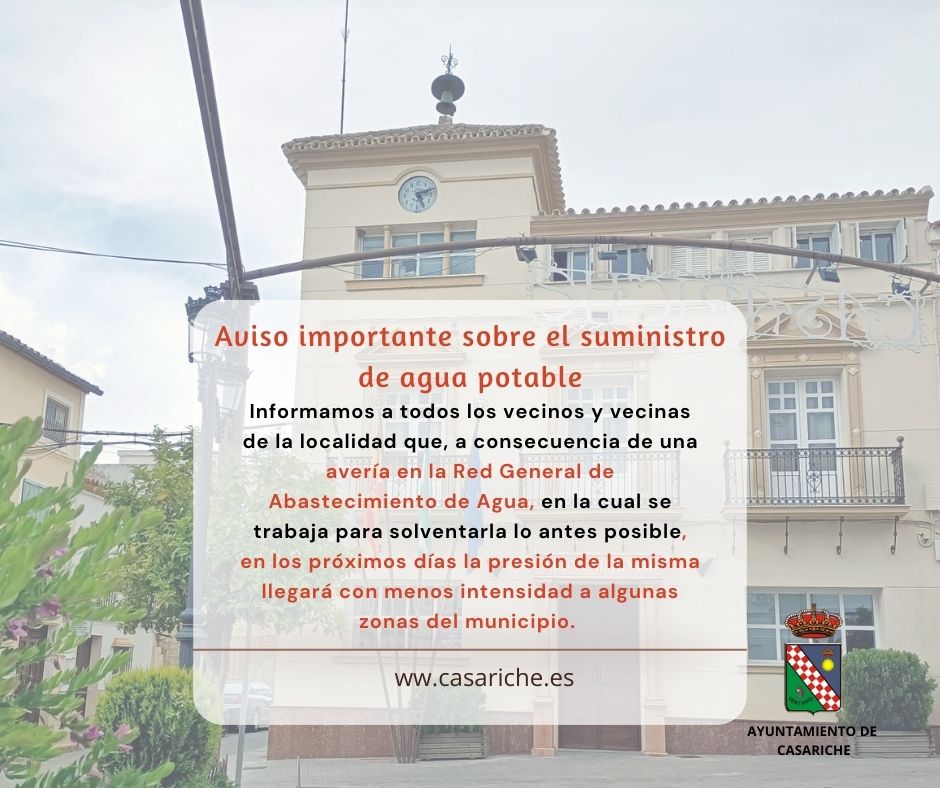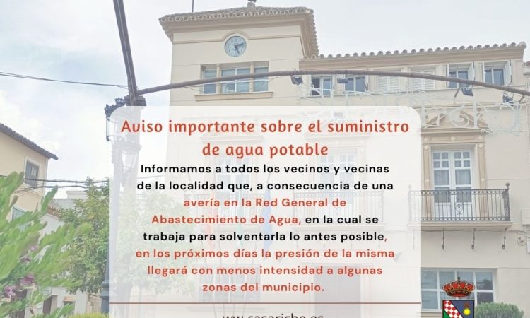 Informamos a todos los vecinos y vecinas de la localidad que se ha producido una avería en la Red General del Suministro de Agua y, que por ende, hasta que esta no quede solventada el agua va a llegar con menos presión a algunas zonas del municipio en los próximos días.