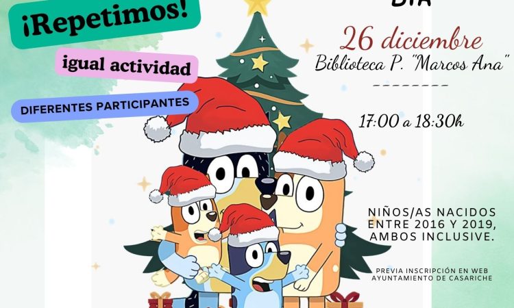 Debido a la gran aceptación que ha tenido esta actividad y que las plazas del cuentacuentos previsto para el día 20 se han agotado rápidamente, el 26 de diciembre repetiremos el cuentacuentos ‘Navidad con Bluey’ para que más niños y niñas nacidos entre 2016 y 2019 puedan asistir.