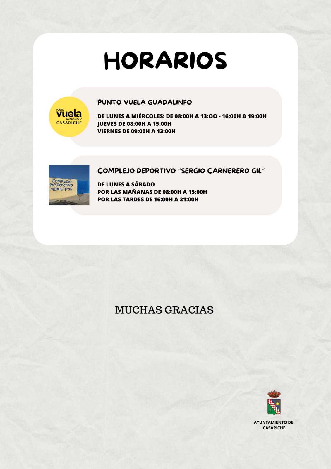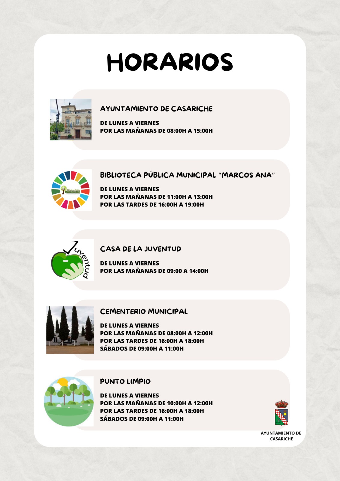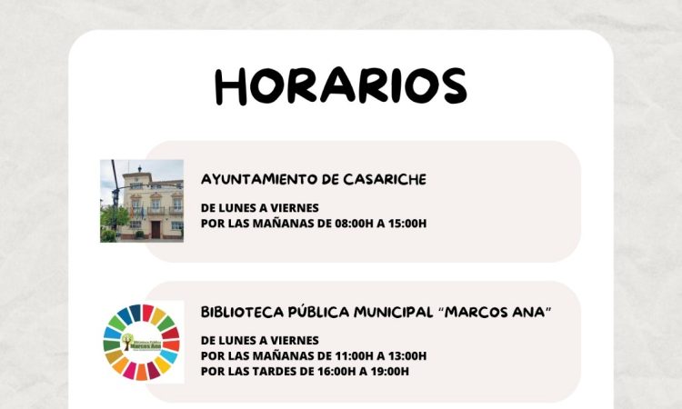 - Ayuntamiento de Casariche: de lunes a viernes, de 08:00h a 15:00h por las mañanas.