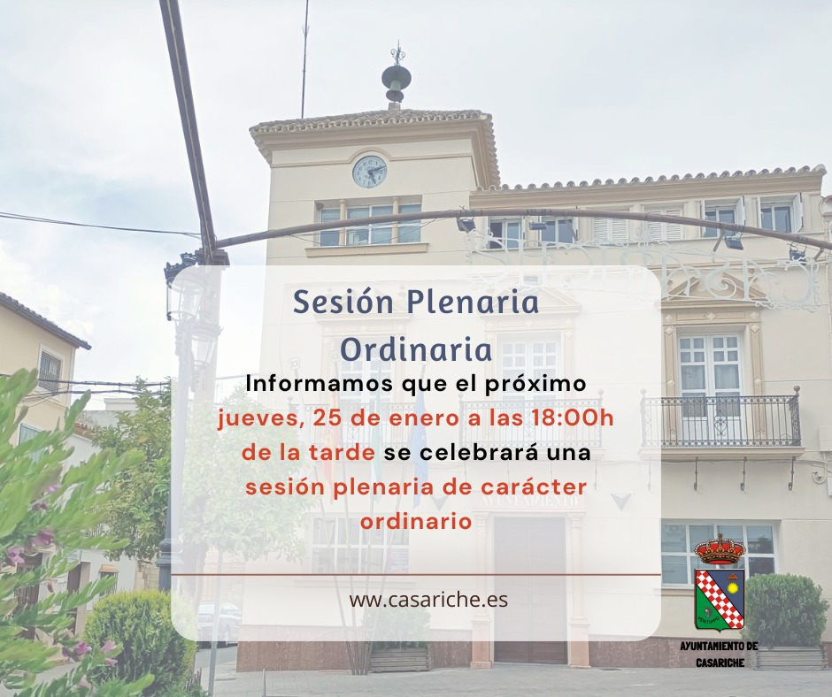 Informamos a todos nuestros vecinos y vecinas que mañana jueves 25 de enero a las 18:00h de la tarde se celebrará una sesión plenaria de carácter ordinario en el Salón de Plenos Municipal, que consta del siguiente orden del día: