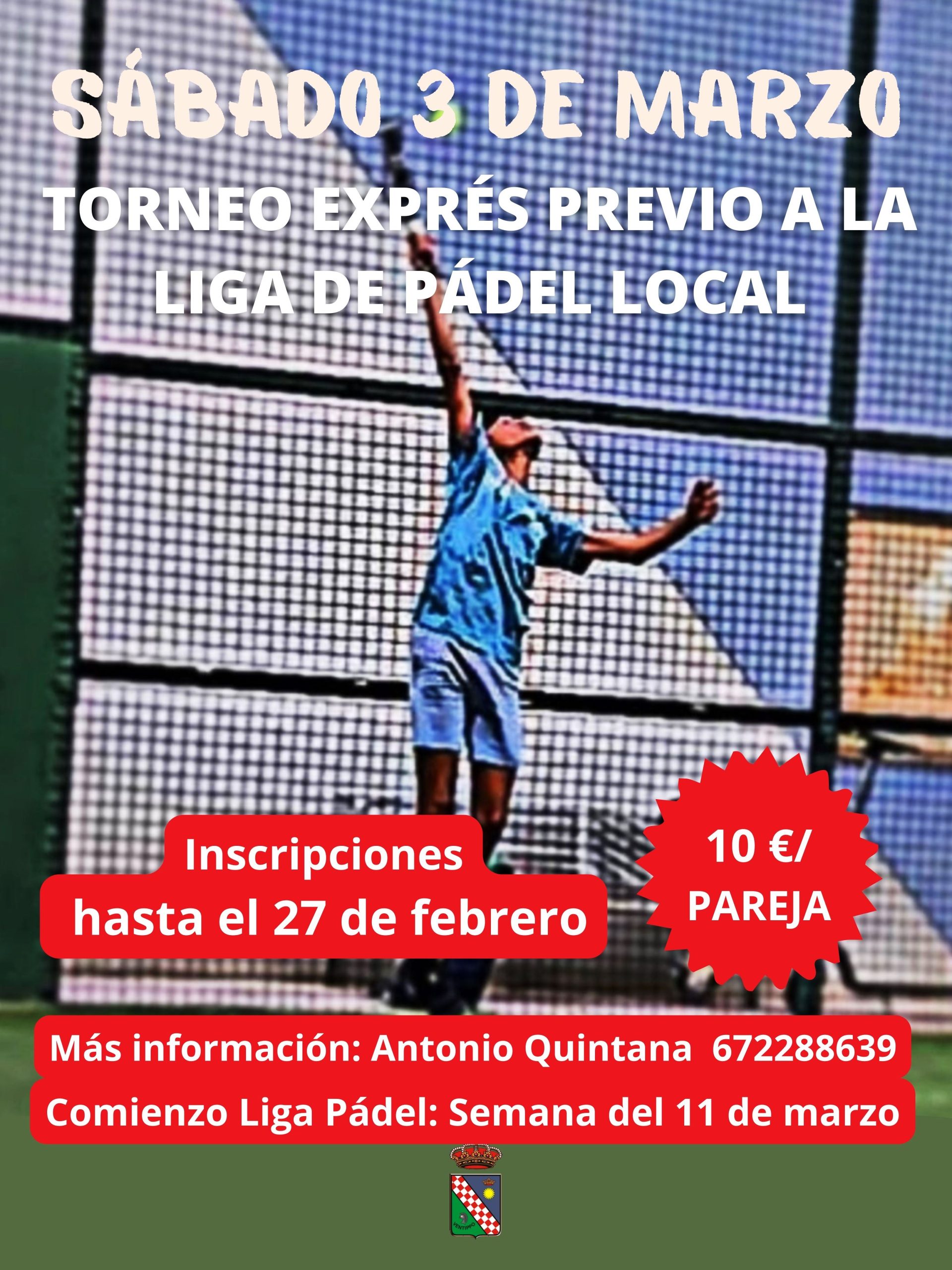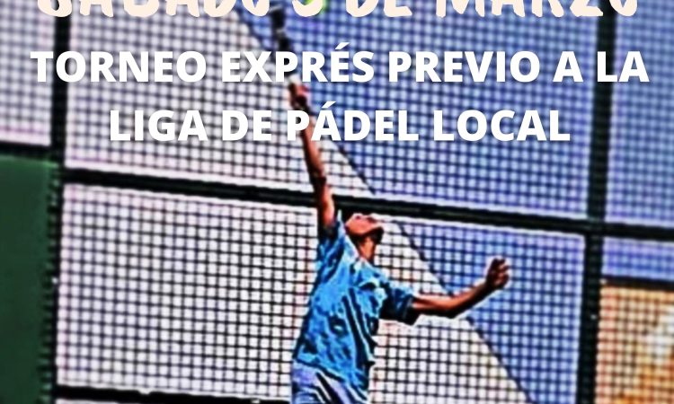 Desde la Delegación de Deportes, se ha organizado un Torneo Exprés de Pádel que se celebrará el sábado 3 de marzo, previo a la Liga de Pádel cuyo inicio está previsto en la semana del 11 de marzo.