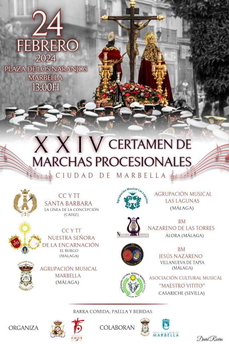 En el día de hoy, se celebra el XXIV Certamen de Marchas Procesionales Ciudad de Marbella, que dará comienzo a las 13:00 h en la Plaza de los Naranjos de esta localidad malagueña, y entre las bandas participantes, estará la Asociación Cultural Musical Maestro Vitito de Casariche.