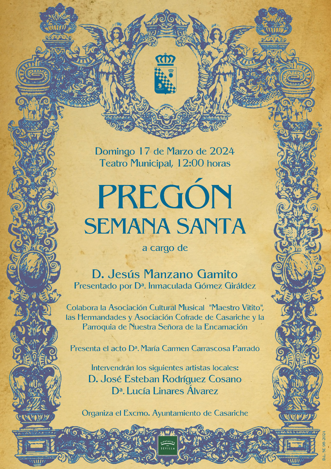 Este solemne acto anunciador de la Semana Santa casaricheña será conducido por María Carmen Carrascosa Parrado y contará con las intervenciones de la Asociación Cultural Musical ‘Maestro Vitito’ de Casariche y de los artistas locales José Esteban Rodríguez Cosano y Lucía Linares Álvarez.