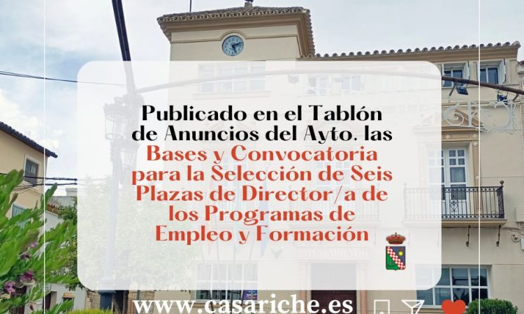 Desde la Delegación de Empleo informamos que ya se pueden consultar en el Tablón de Anuncios del Ayuntamiento y en el E- Tablón las Bases y Convocatoria para la Selección de 6 plazas de Director/a para los Programas de Empleo y Formación de nuestro Ayuntamiento.