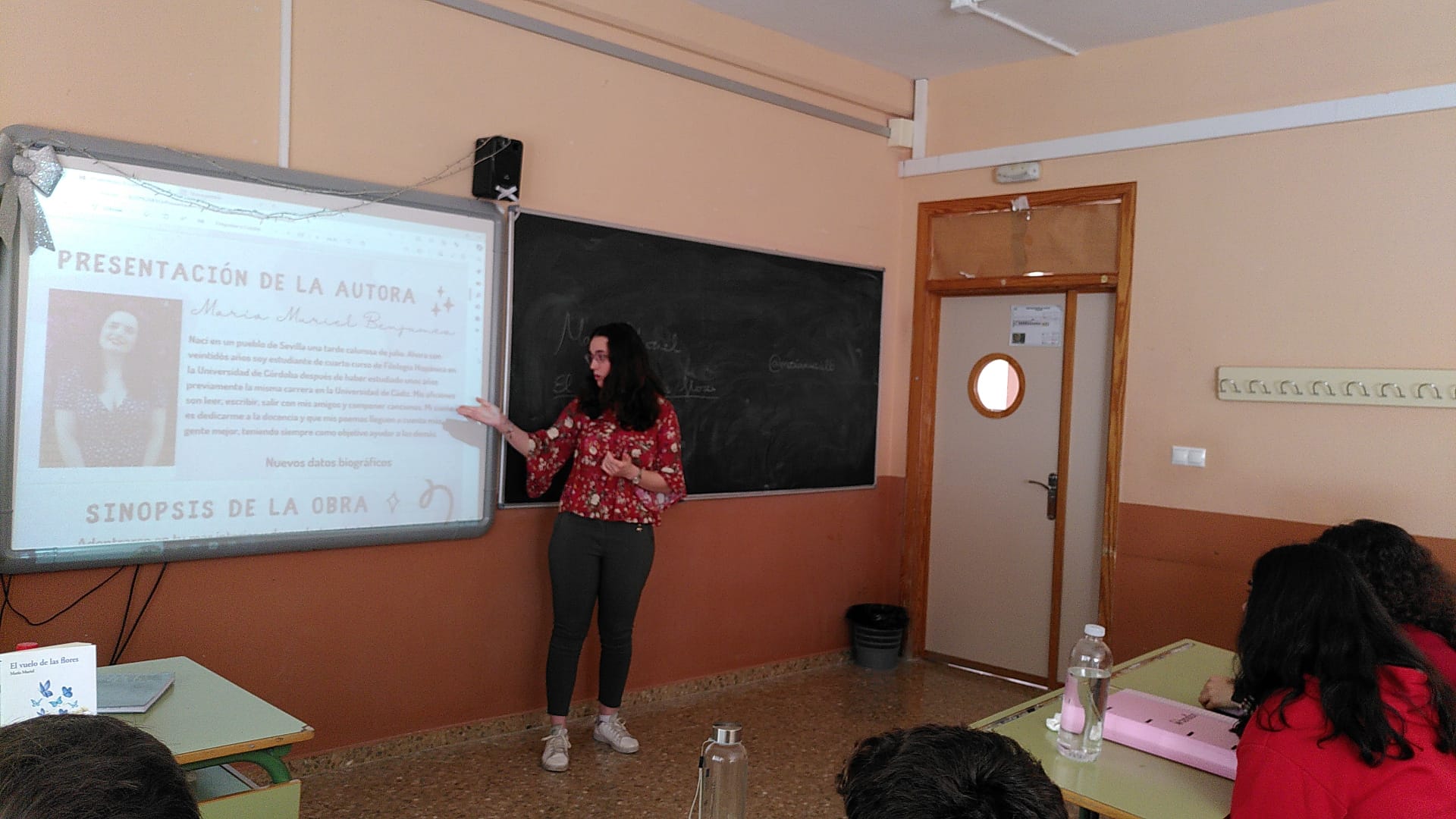 La joven poetisa herrereña María Muriel presentó el pasado viernes su libro ‘El vuelo de las flores’ al alumnado de 3º de ESO del IES Atalaya, trabajando con nuestros escolares una selección de sus poesías consensuada previamente con José Manuel Caballero Vargas, Jefe del Departamento de Lengua y Literatura del centro.