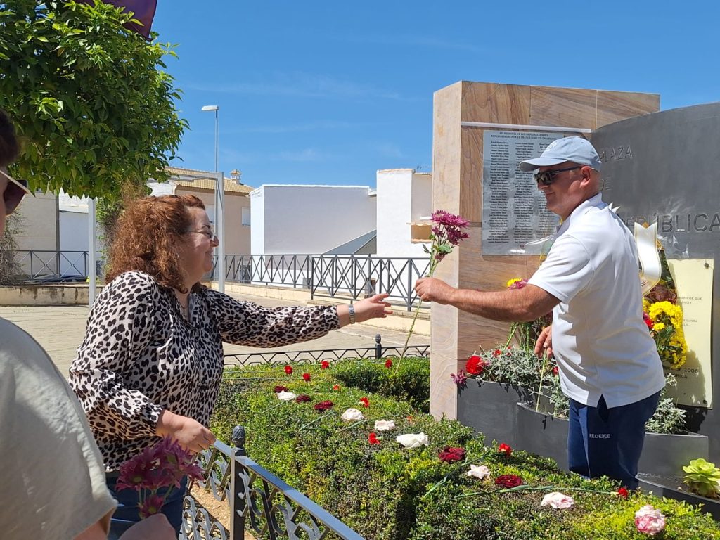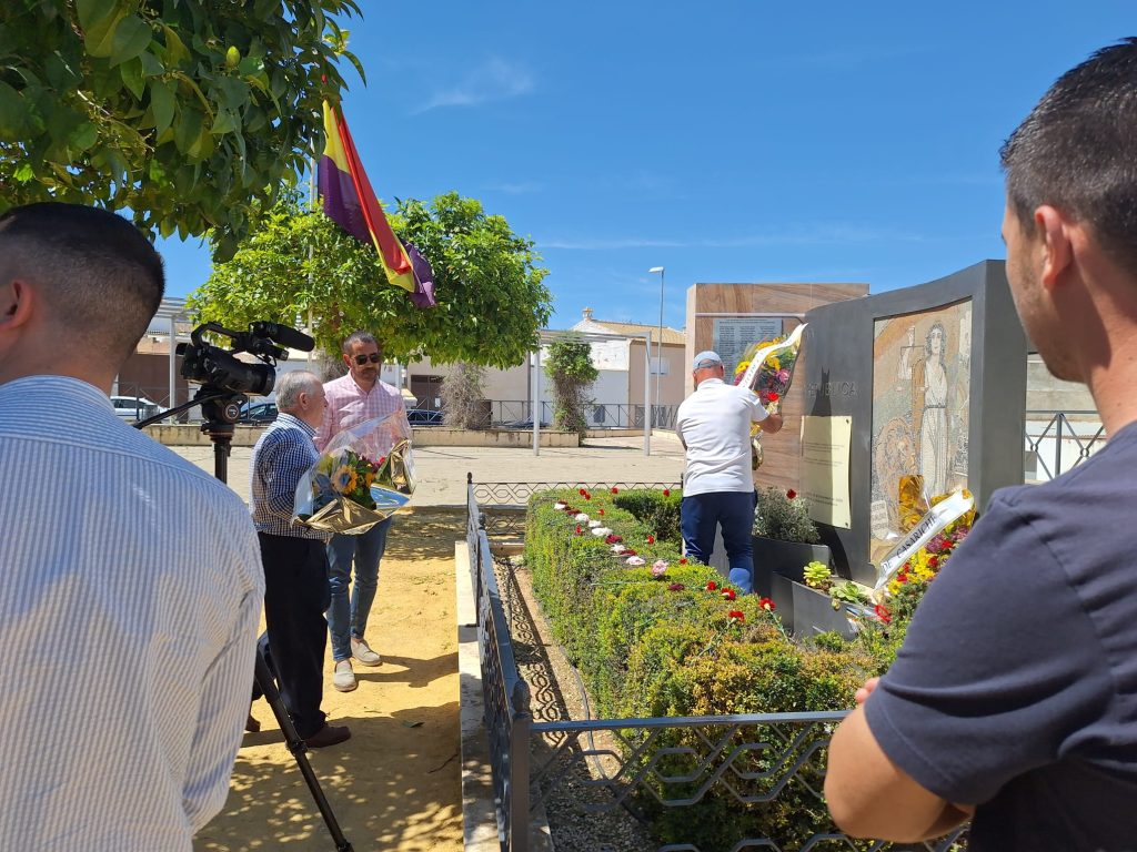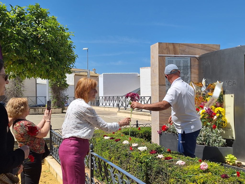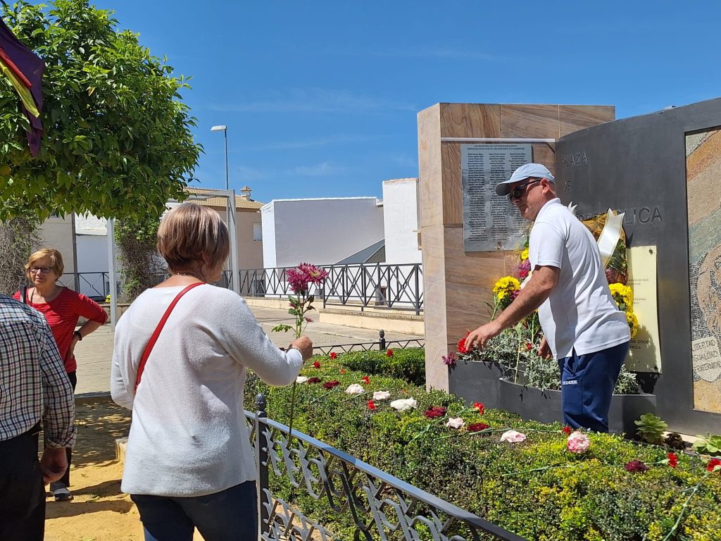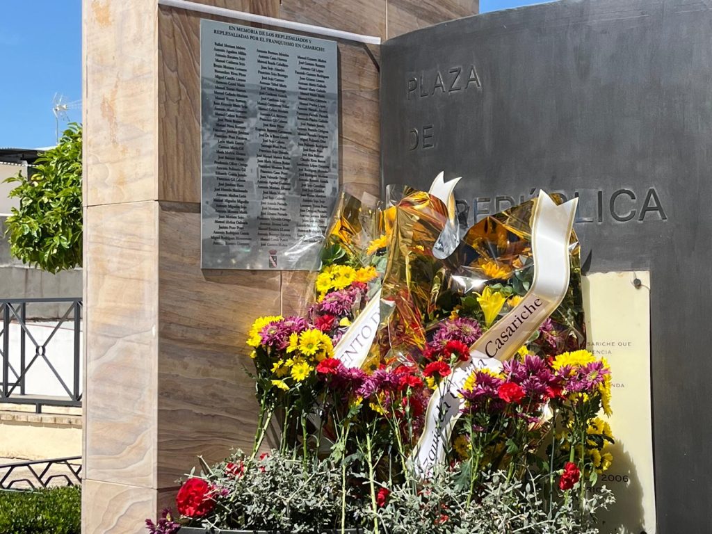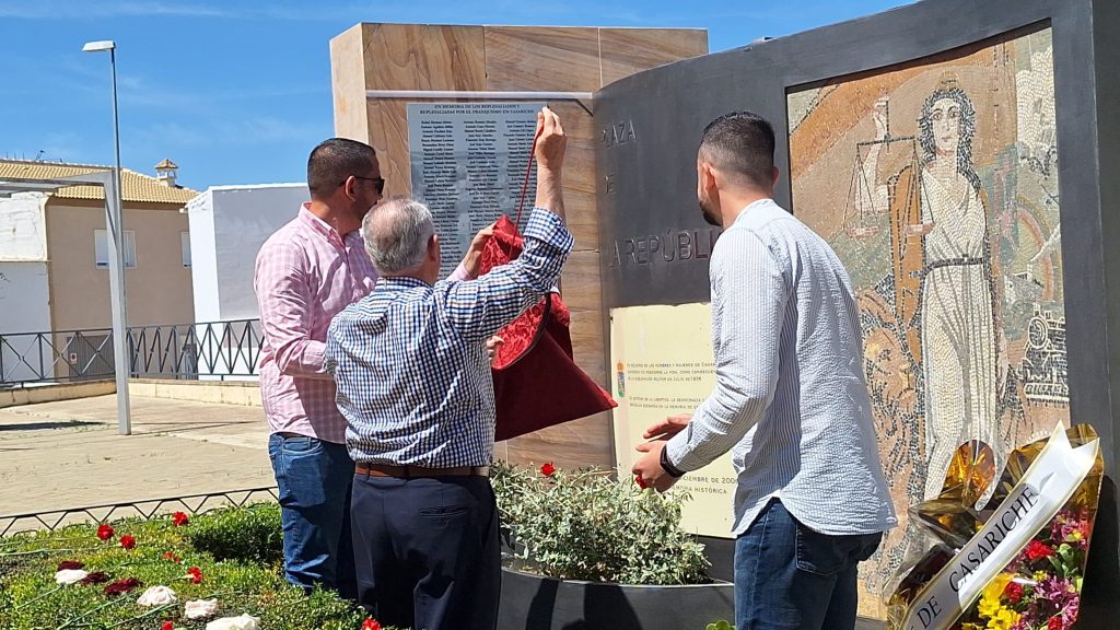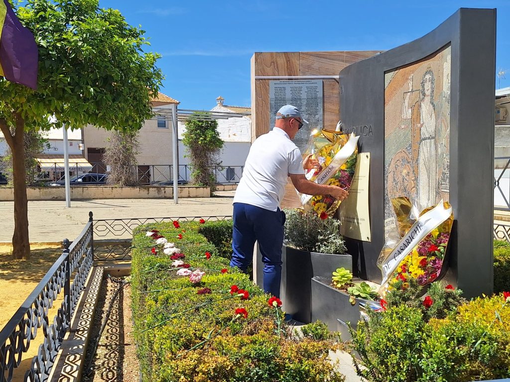 Seguidamente, los actos continuaron en la Plaza de la República, donde se llevó a cabo el descubrimiento de una placa en memoria de los/as represaliados/as por el franquismo en Casariche, a cargo de nuestro Alcalde, el Concejal de Cultura y ex-alcalde Francisco Moriana, quienes iniciaron a continuación una ofrenda floral, en la que después fueron participando los numerosos vecinos y vecinas allí presentes.