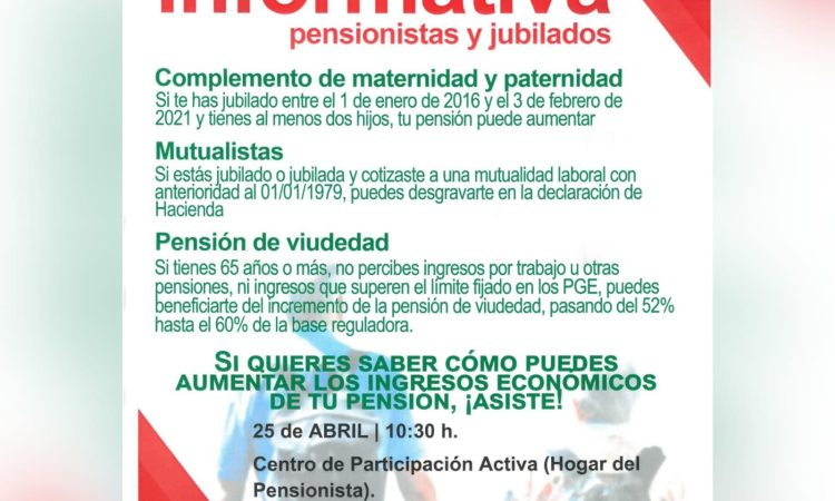 Informamos que este lunes 25 de abril CCOO Sevilla visitará Casariche para ofrecer una charla informativa dirigida a todas las personas pensionistas y jubiladas de nuestra localidad sobre las pensiones.