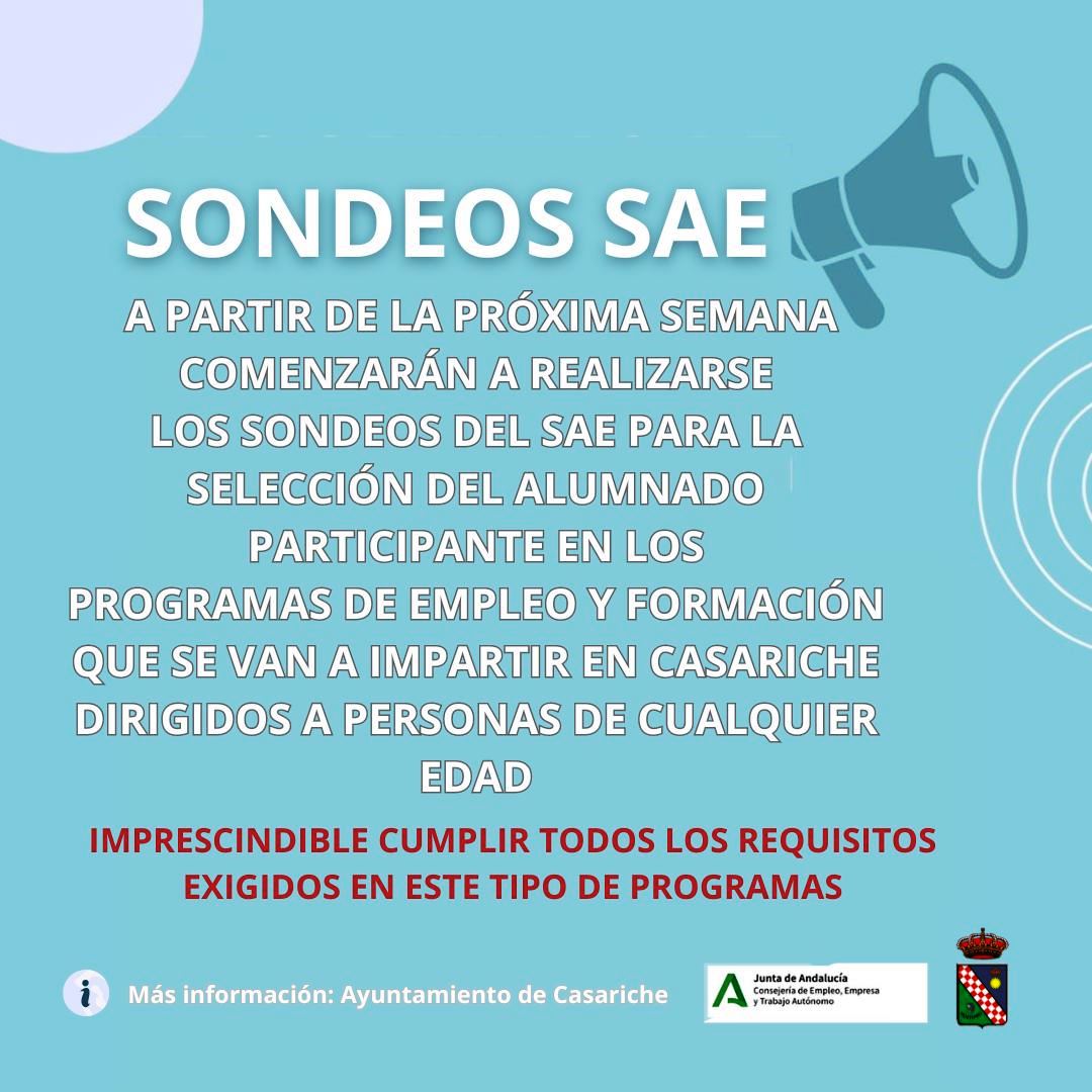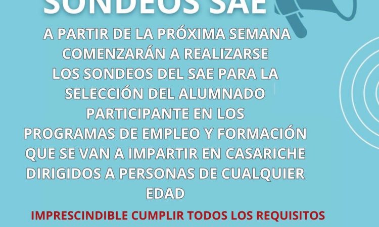 El Ayuntamiento informa que la próxima semana comenzarán los sondeos del Servicio Andaluz de Empleo (SAE) para la selección del alumnado participante en los programas de empleo y formación dirigidos a personas de cualquier edad que se van a impartir en Casariche, que son Mecánica de Automóviles y Jardinería 2.