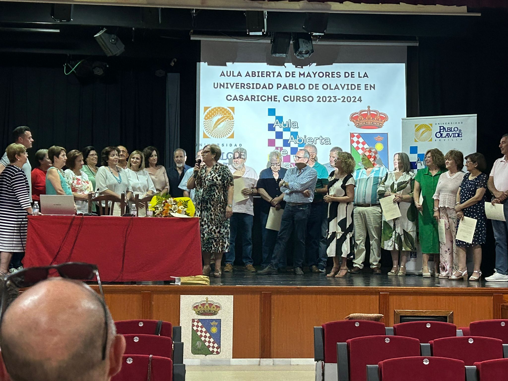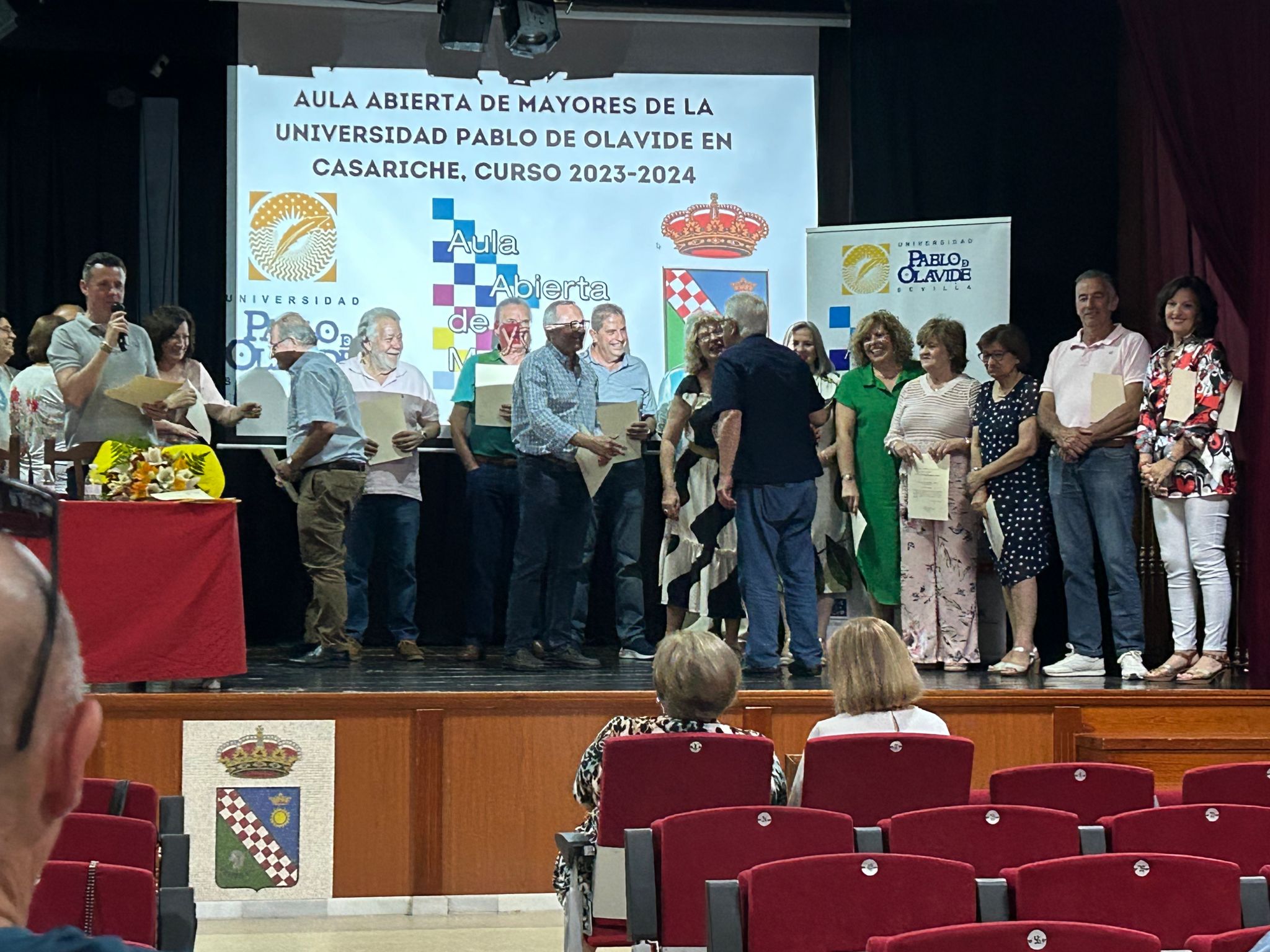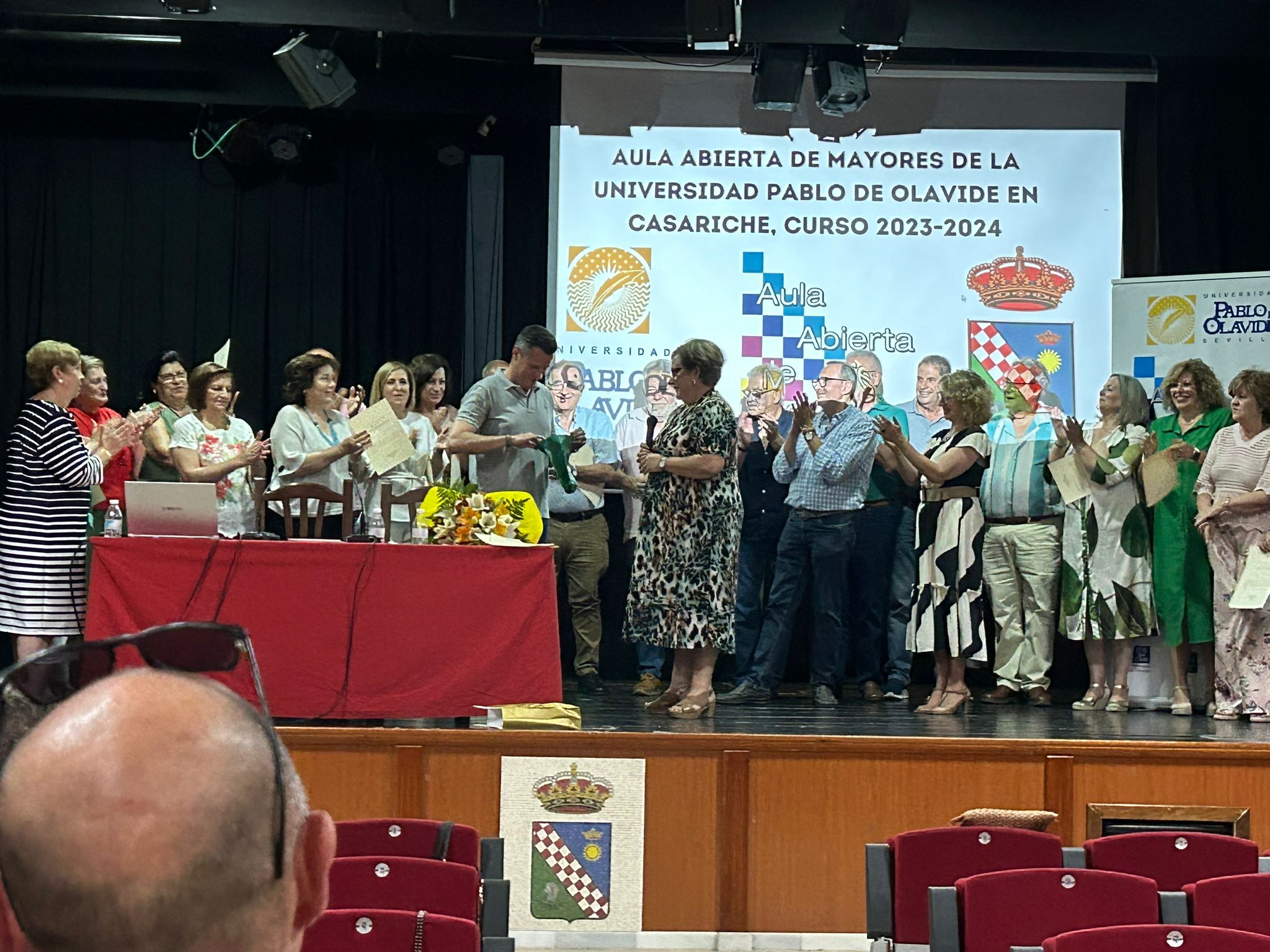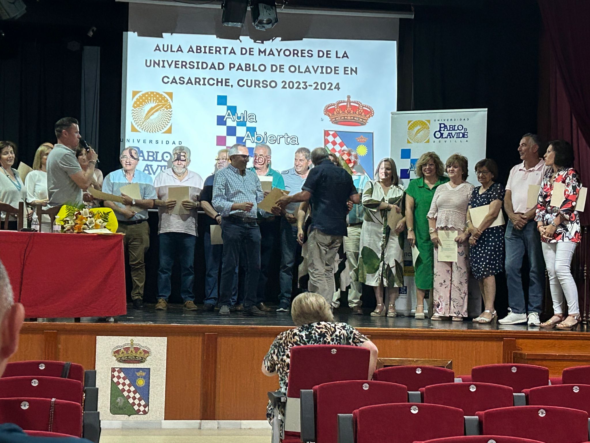 Nuestro Teatro Municipal acogió ayer martes el acto de clausura del curso escolar 2023/2024 del Aula Abierta de Mayores de la Universidad Pablo Olavide (UPO) de Casariche, que fue conducido por la Directora Académica del Aula Abierta de Mayores, Dª. Rocío Cruz, y el Coordinador local de este programa, Javier Quesada, y contó también con la asistencia de la Concejala Blanca Moriana.