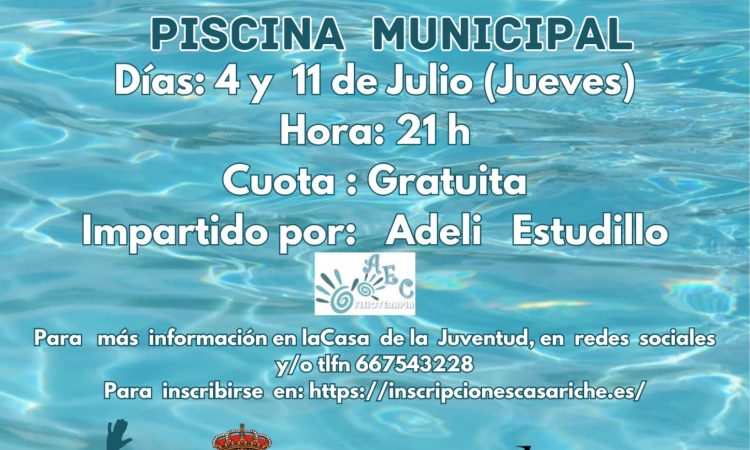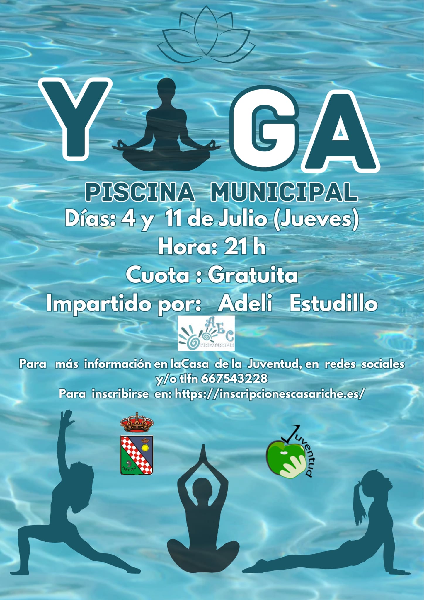 Desde la Delegación de Juventud del Ayuntamiento, hemos organizado este mes de julio dos sesiones de yoga en la piscina municipal, que se llevarán a cabo los jueves 4 y 11 de julio, a partir de las 21:00 h, que serán impartidas por Adeli Estudillo (AEC Fisioterapia).