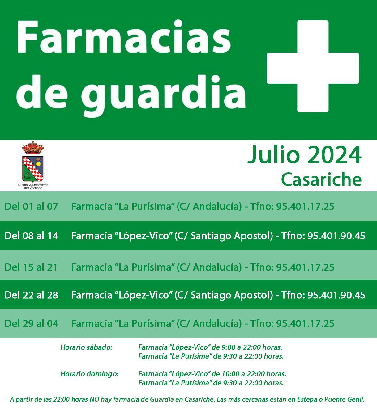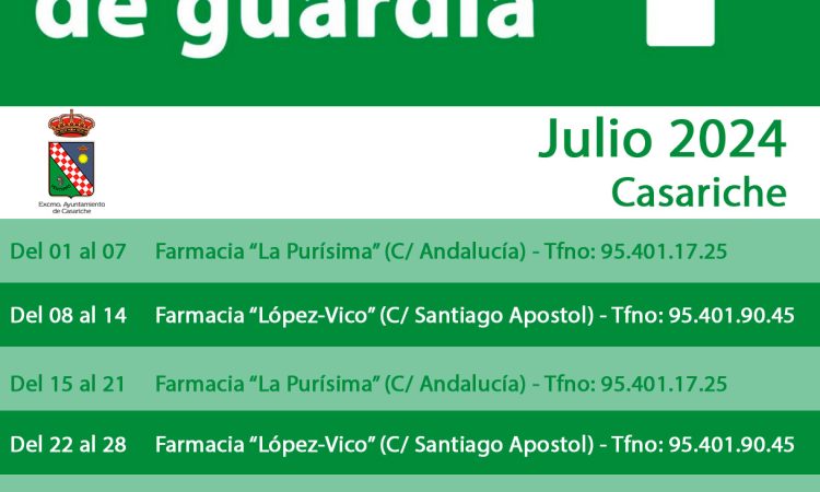 El primer fin de semana de julio estará de guardia la farmacia «La Purísima», en la Calle Andalucía, en horario de 09:30h de la mañana a 22:00h.