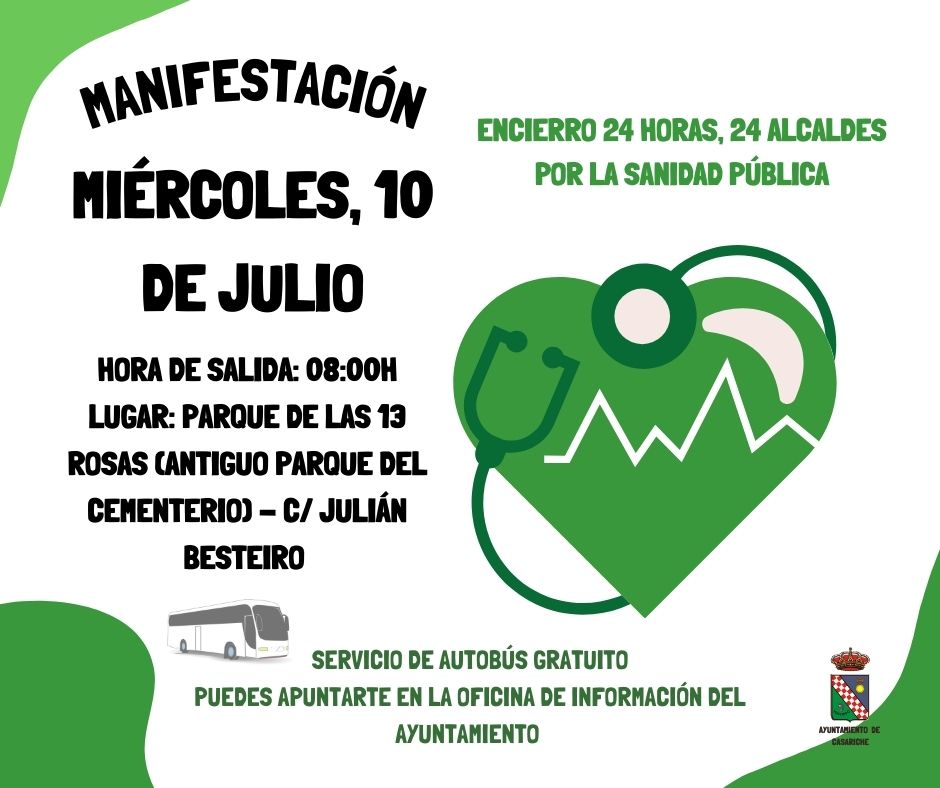 Por ello, desde nuestro Ayuntamiento, se va a poner un servicio de autobús gratuito para que todos los vecinos y vecinas que lo deseen puedan acompañarnos y sumarse a esta protesta en la que nos jugamos el derecho a una atención sanitaria pública digna.