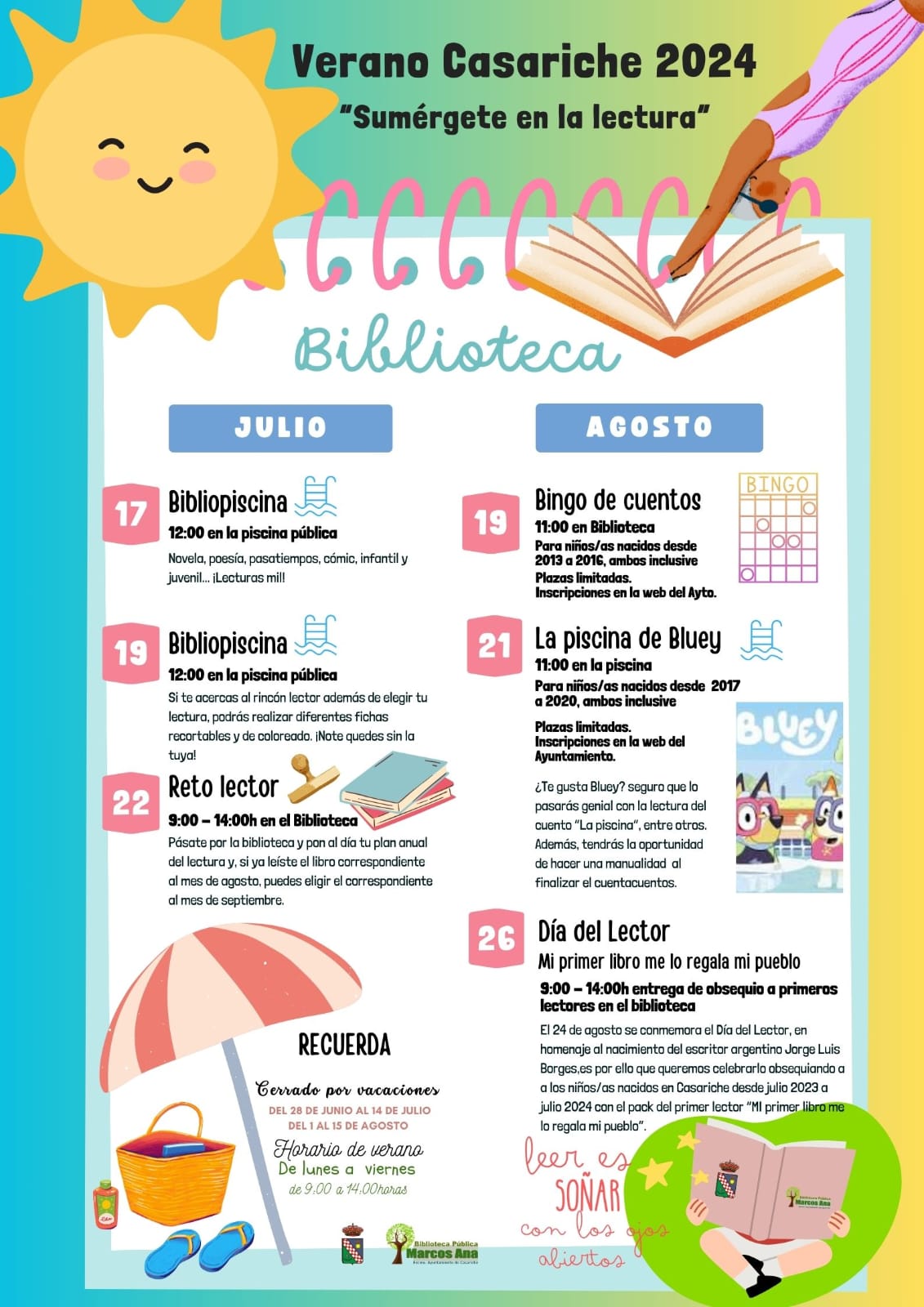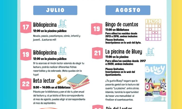 En agosto, un bingo de cuentos el 19 de agosto, una actividad de cuentacuentos con Bluey en la piscina el día 21, y la actividad el Día del Lector ‘Mi primer libro me lo regala mi pueblo’ el lunes 26.