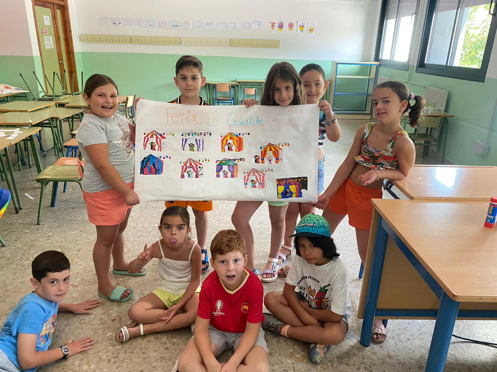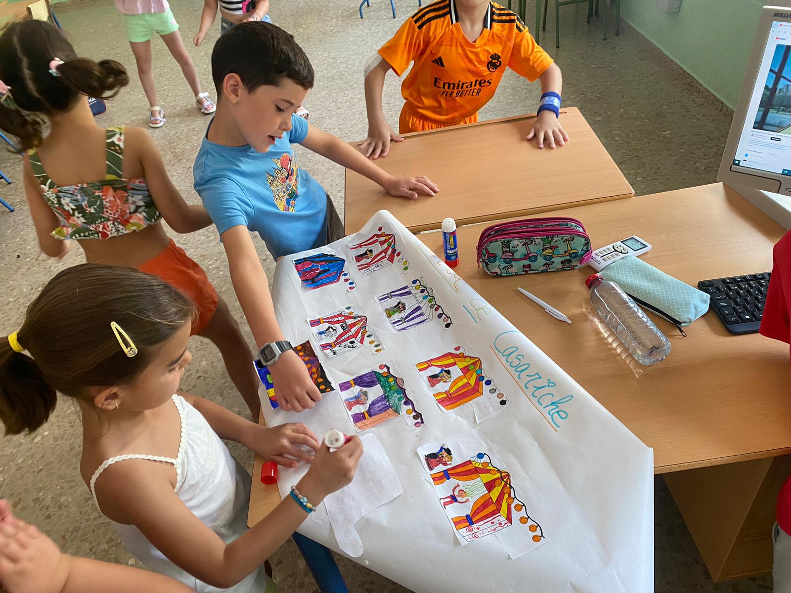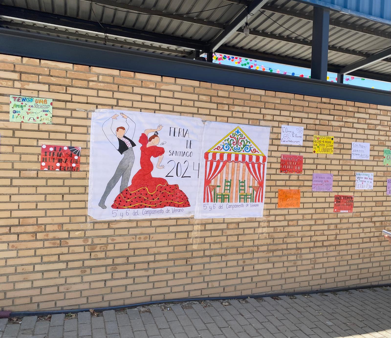 En esta última semana, el alumnado del Campamento de Verano ha participado en distintas actividades relacionadas con nuestra Feria. Entre ellas han asistido a una masterclass de baile, han diseñado objetos decorativos de casetas y han realizado un mural en el que han querido plasmar cómo era la feria de sus abuelos y abuelas.