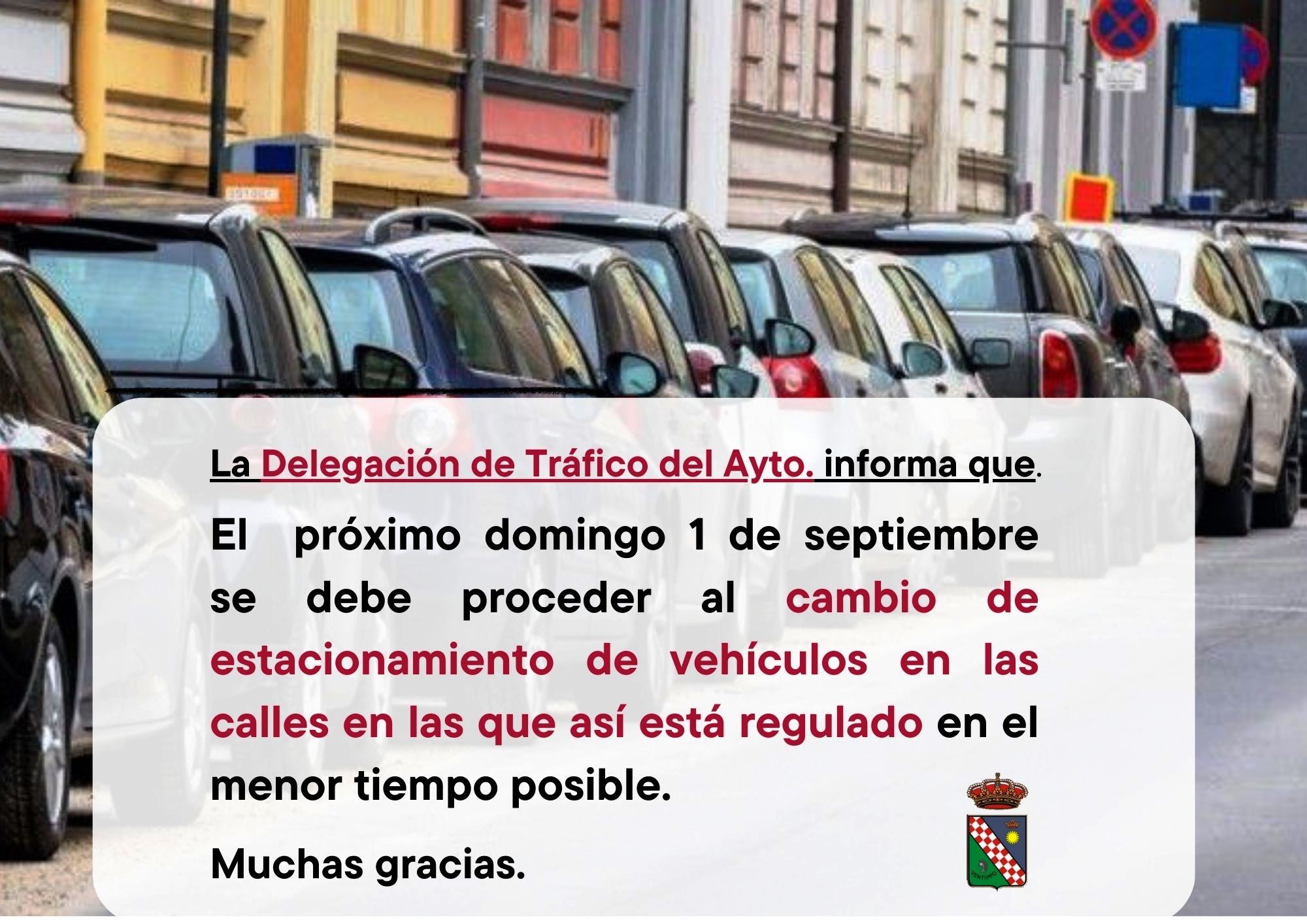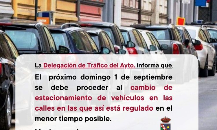 La Delegación de Tráfico del Ayuntamiento recuerda a todo los vecinos y vecinas del municipio que este domingo 1 de septiembre se realizará el cambio de estacionamiento en las calles en las que así está regulado y, que por lo tanto, deberán cambiar sus vehículos lo más pronto posible.
