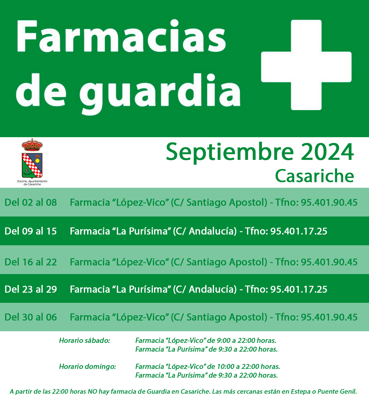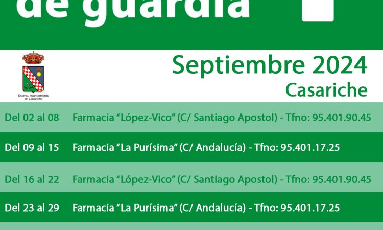 El primer fin de semana de septiembre estará de guardia la farmacia «López – Vico», ubicada en la calle Santiago Apóstol. Su horario de apertura será de 09:00h de la mañana a 22:00h de la noche el sábado y de 10:00h de la mañana a 22:00h de la noche el domingo.